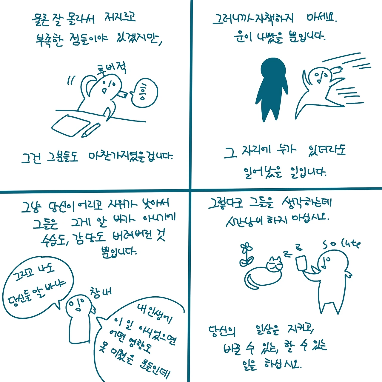 우리는, 아니 모든 사회는 주니어에게 각박하다. 주니어 신입 공고에 경력1년 정도를 넣는것도 그렇고. 잘하기를 바란다. 잘하기를 바랄 수 있지 나도 잘하기를 바란다. 잘하려고 해왔고 성장하려고 해왔다. 그런데 잘하기를 바람을 넘어서 압박이 되어가고, 그게 문제가 되어 어떤 결과로 너무 쉽게 이어졌다. 모두에게 나의 인생은 알 바가 아닌셈이다. 그러니 우리도 그들을 알 바 아닌 존재로 넘겨버리면 된다. 그냥 오늘 할 일을 하면서 살아갈 뿐이다.
