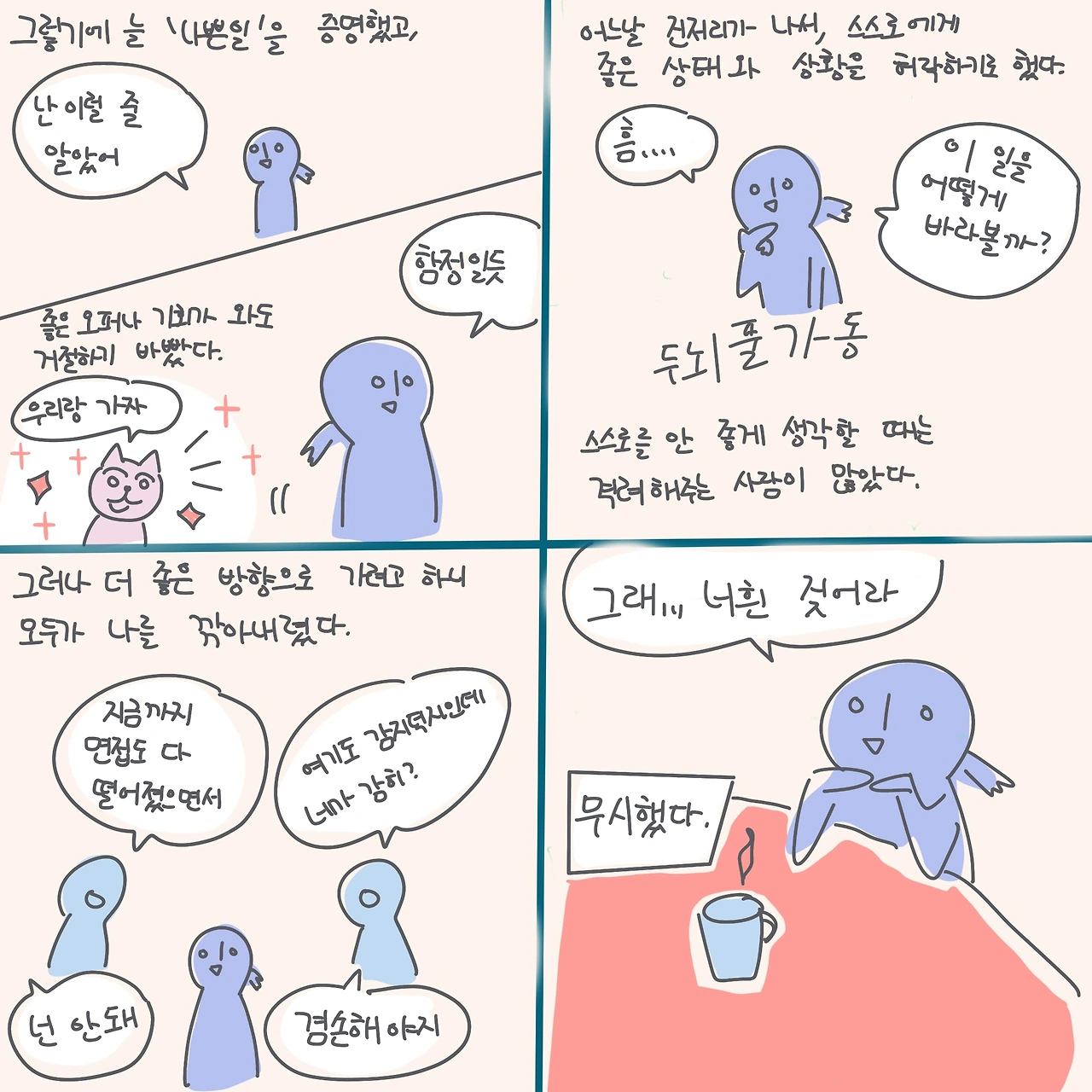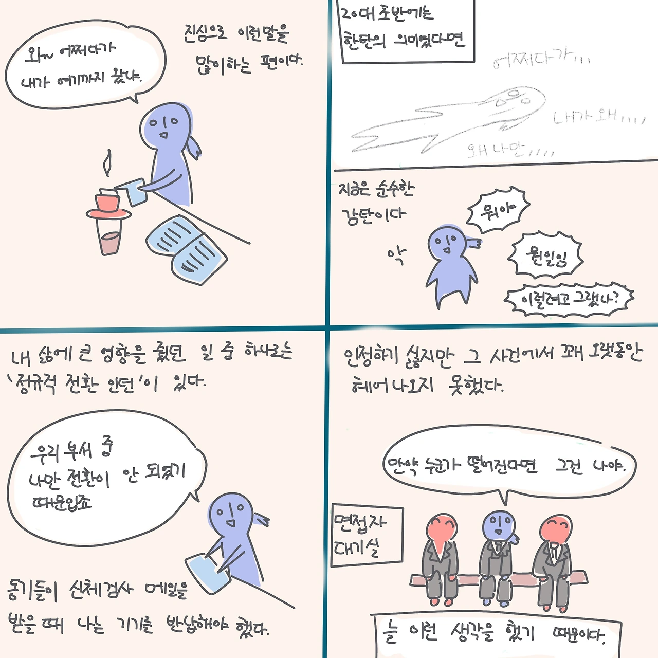 어렸을 때는 보통 이게 안 좋은 의미인 한탄으로 쓰였는데 지금은 그냥 순수하게 감탄하면서 사용한다. 나의 기나긴 취준(이라기엔 여러 일을 했었지만)에서 꽤 내게 오랫동안 영향을 미친 사건이 있다. 부서 인턴 중 유일하게 정규직 전환을 실패한 사건이다.