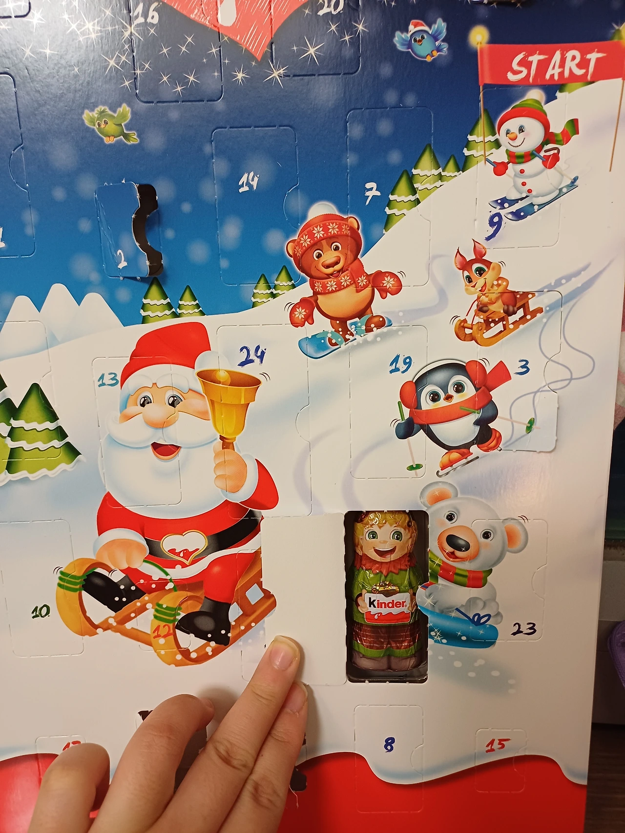 어드벤트인지 벤터인지는 잘 모르겠다. 오늘이 23일이고 오늘 초콜릿을 먹었으니 이제 하나 남은 셈이다. 지금 남은 초콜릿 칸 크기를 보아하니 꽤 큰 녀석이 들어있는 듯하다. 하지만 이전에도 큰 크기의 박스를 보고 오예, 했더니 그냥 속이 빈 강정이었어서 이번에도 그려려니 하고 있다.