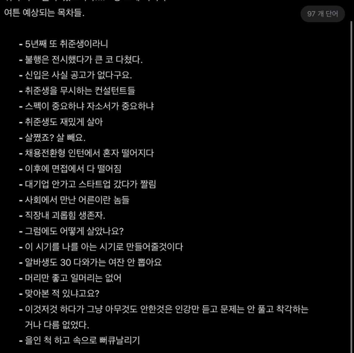 목차에서는 세상을 향한 한탄과 분노와 호소하고 싶어 안달 난 감정이 느껴진다. 실제로 처음의 이 글의 목적이 그것이기도 하고. 조금씩 바뀌기 시작한 이유는 한탄과 분노와 고발로는 나의 이 5년, 누군가의 현재일 지금을 표현하기 어려웠기에. 낙오자니 실패자니 같은 친구들끼리 대기업이니 명문대니 연봉이니 하면서 서로 선과 순서를 짓는 지금이다. 그 시기를 살아가는 2030 세대의 절망과 한계만을 말하고 싶지 않았다.