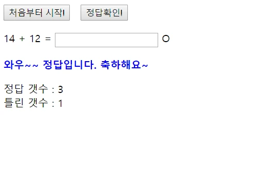 지금은 이렇게 시작하고, 아들과 같이 산수퀴즈 화면을 만진 횟수만 3, 4번은 되는 것 같다. 그 사이 꽤 발전했다. "처음부터 시작" 버튼을 눌러서, 처음 시작과 리셋을 할 수 있다. "정답 확인" 버튼을 누르면 정답, 오답에 따라 안내 메시지를 보여준다. "와우~~~ 정답입니다. 축하해요.~" 이런 식으로 보여주면 아들이 아주 좋아한다. 그리고, 정답을 맞추면 다음문제가 자동으로 나간다. 조금전까지 40문제 이상을 연속으로 맞춘 주호가 이제 문제가 너무 쉽다고 한다. 레벨을 만들어야겠다는 생각이 들었다. 그리고, 정답을 맞추면, 음성으로 축하 메시지가 나왔으면 좋겠다고 주호가 의견을 낸다. 그것도 해야겠다. 매일 했던 것을 기록 할 수 있게 디비도 붙여봐야겠다.