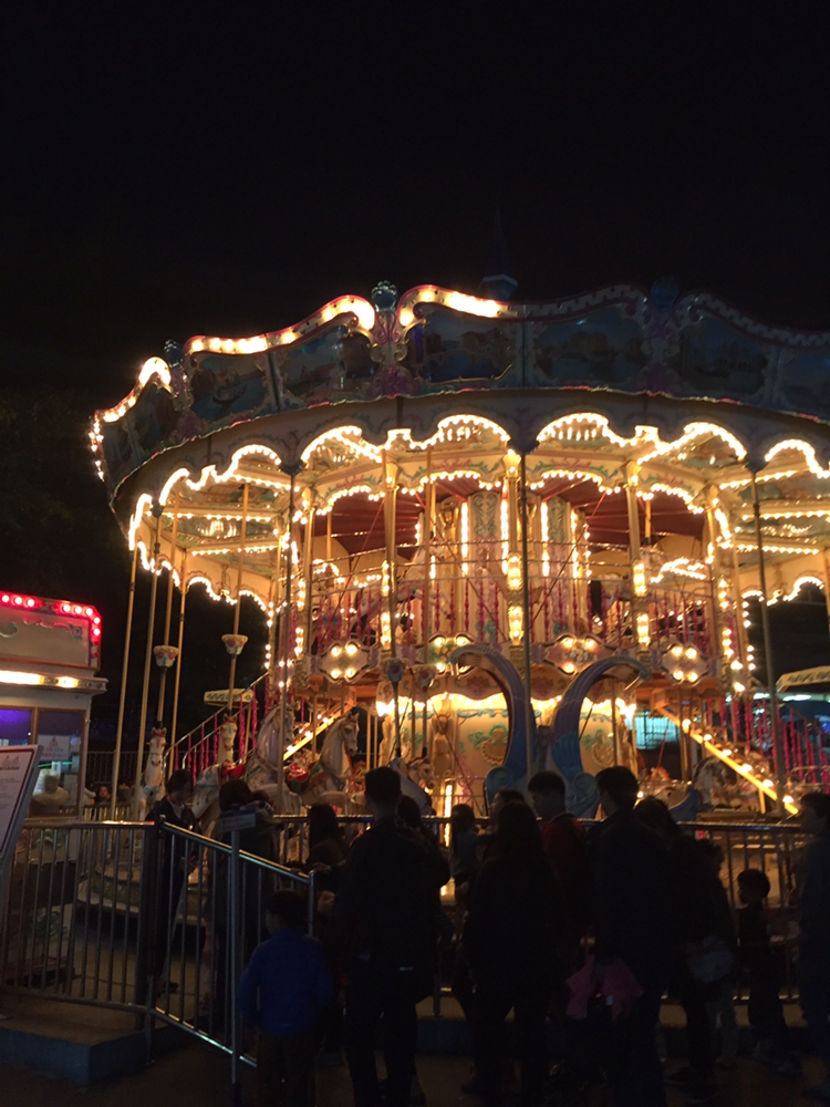 놀이기구 몇 개 타고 나니, 벌써 하늘이 어둑어둑 해지기 시작했다. 겨울이 다가오니 해가 많이 짧아졌다. 저녁 7시가 되니 주변이 깜깜해졌다. 어두워지고나니, 회전목마가 빛을 발하기 시작했다. 예전에는 회전목마가 이렇게 예쁜 것인 줄 몰랐다. 아름답구나. 더구나 2층 회전 목마라니.. 나도 타보고 싶었으나, 짐을 지켜야 했다.