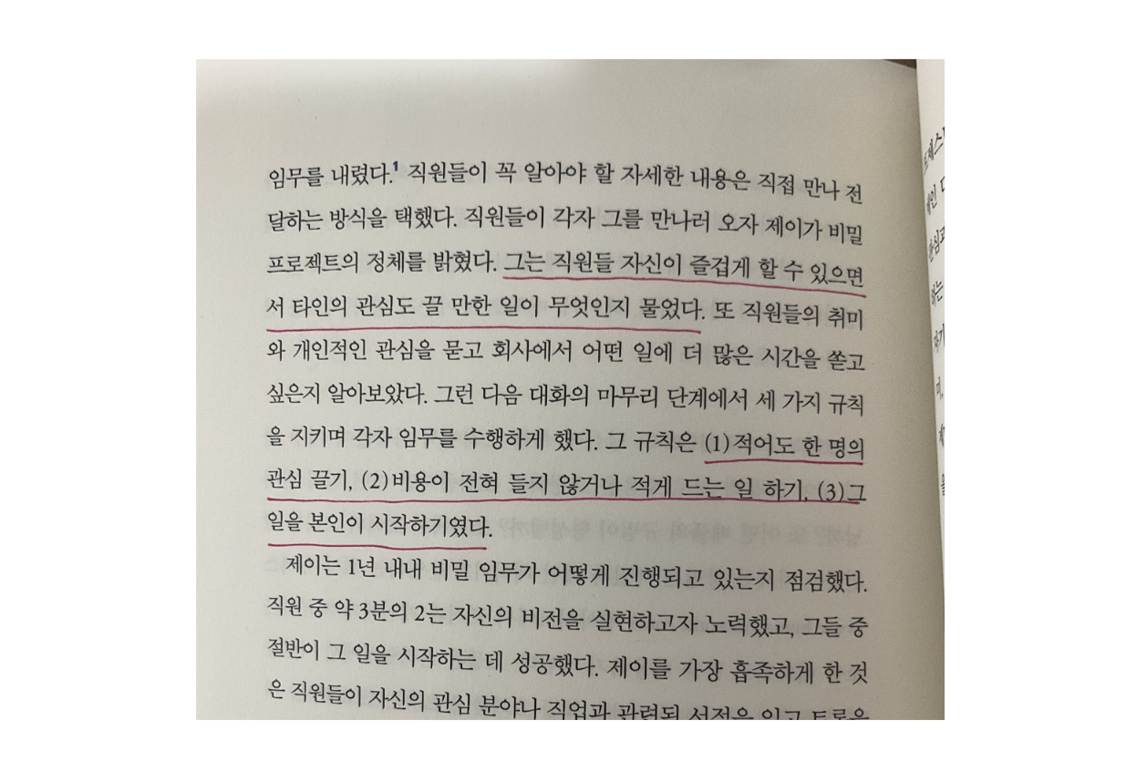 개인적으로는 '5장 겸손한 승리'와 '6장 이기적인 이타주의자'가 가장 인상 깊었다. 이 장들은 타인의 이야기를 경청하고 도움을 구하는 방법을 다루며, 베품을 통해 얻을 수 있는 활력에 대한 통찰을 담고 있다. 이 장들에서 배운 부드러운 의사소통 방식과 베푸는 활동을 내 삶에서 실천하려고 한다.