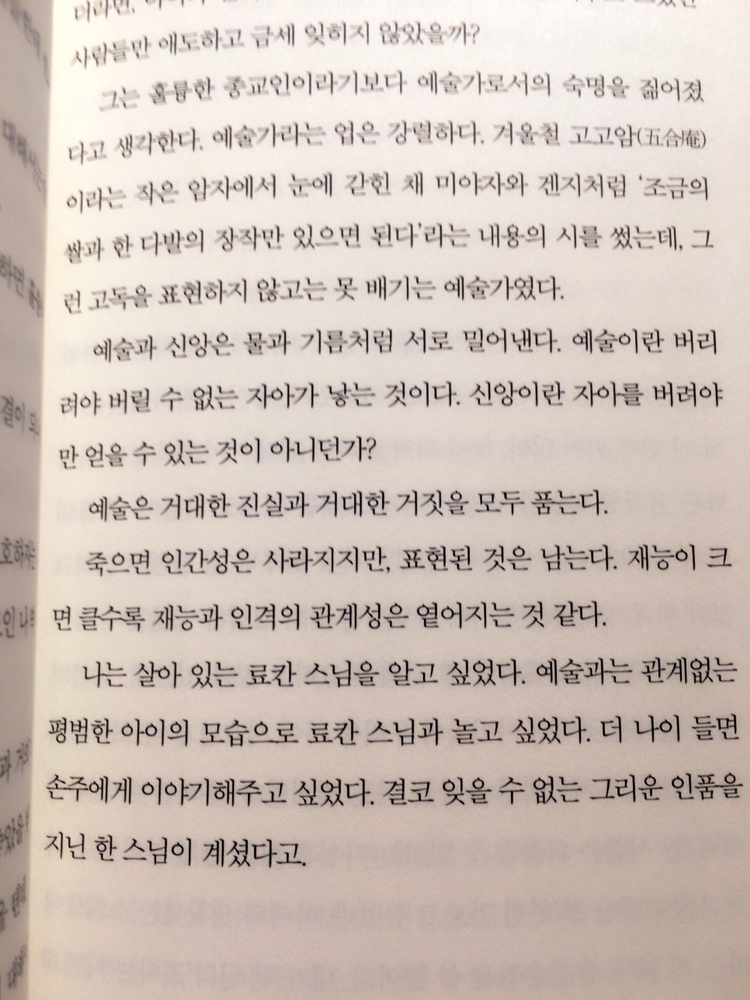 그럼에도 너무나 공감가는 부분이 있었다. 그녀의 전반적인 생각 중에 디테일한 부분의 어떤 철학은 나의 생각과 많이 닮아있기도 했다. 예술과 종교에 대한 생각이었는데, -예술과 신앙은 물과 기름처럼 서로 밀어낸다. 예술이란 버리려야 버릴 수 없는 자아가 낳는 것이다. 신앙이란 자아를 버려야만 얻을 수 있는 것이 아니던가? 예술은 거대한 진실과 거대한 거짓을 모두 품는다. 죽으면 인간성은 사라지지만, 표현된 것은 남는다. 재능이 크면 클수록 재능과 인격의 관계성은 옅어지는 것 같다.<본문 中>- 이렇게 서술을 했다. 나의 생각과 동일했다. 종교가 있는 내게 예술은 너무나 큰 장벽으로 다가오는 순간도 있다. 신의 손바닥 안에서 신의 관심과 지도를 받으며 살아야하는 종교인에게 자아를 절대 버려선 안 되고 오히려 그 자아를 깊게 찾아가는 길에 있어야 할 예술인의 모습은 섞이기 힘든 그림이다. 그 어려운 숙명도 계속 안고가야 할 사람은 고민이 많을 수밖에. 그녀의 그런 생각은 맞장구를 신나게 쳐주는 친구 한명을 만난 것과 같은 느낌을 주기도 했다.