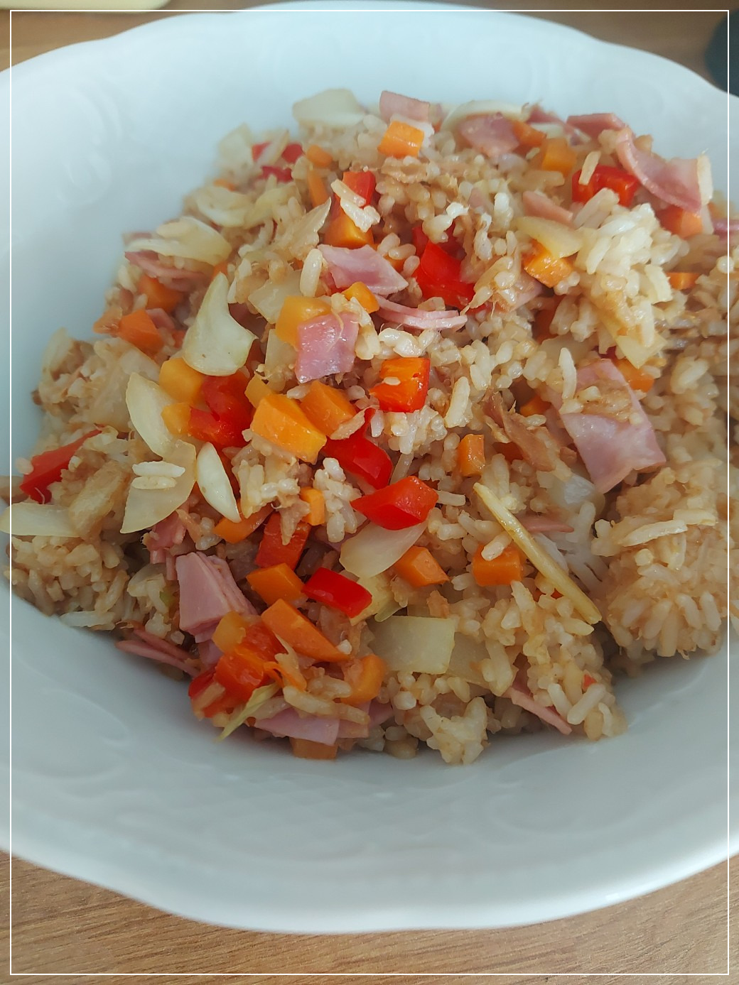 하얀 접시 위에 담긴 볶음밥은 훨씬 더 먹음직스러워 보였다.