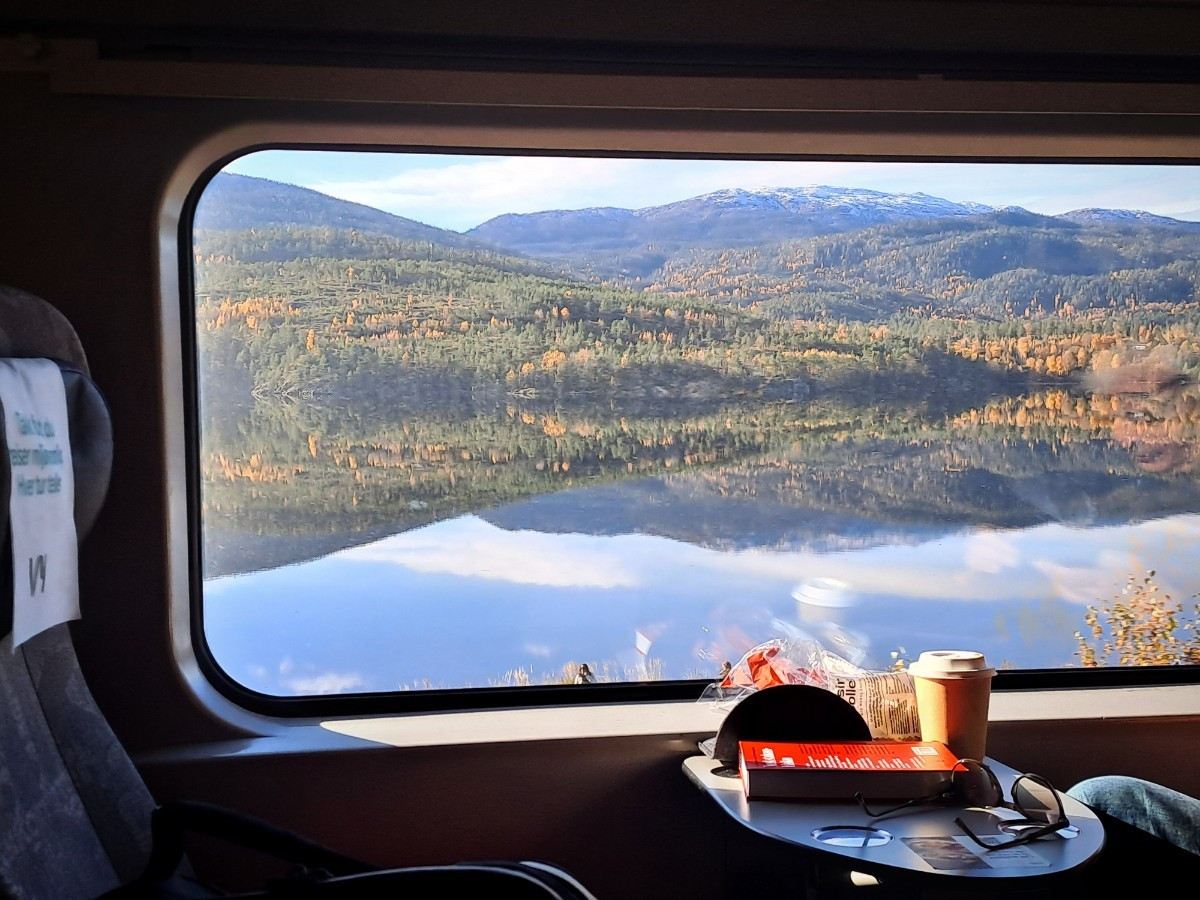 기차 안에는 예상보다 많은 사람들이 있었다. 아이와 함께한 가족, 혼자 여행하는 사람, 친구들과 동행한 어르신들까지 다양한 이들이 자리하고 있었다. 기차는 8시간 동안 서쪽에서 동쪽으로 달리며, 작은 마을과 산을 넘나들었다. 마치 노르웨이의 자연이 자랑이라도 하듯, 기차 창밖으로 아름다운 풍경이 펼쳐졌다. 가을의 울긋불긋한 단풍에서 시작해 점차 눈 덮인 겨울 풍경으로 변해가는 모습에 감탄을 금치 못했다. 아빠는 친구들에게 보여주겠다며 연신 사진을 찍으셨다. 나 역시 아침 일찍 시작한 하루라 피로가 몰려왔지만, 이 멋진 풍경을 놓치기 아까워 커피를 마시며 졸음을 쫓았다.