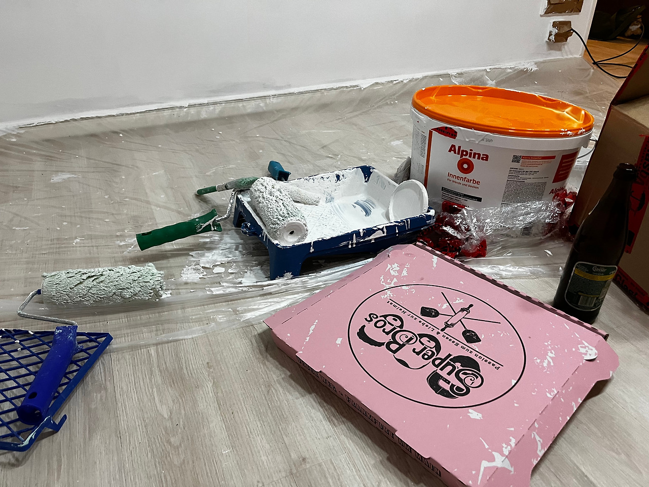 낙서를 신나게 하고 친구들 오기 전에 덮으려고 했는데 두 번을 덧칠해도 생각보다 멀리서 보면 보여서 당황했다. 유치하고 부끄러워라. 다급한 마음이 생겨 전화위복이랄까, 다행히 친구들이 오기 전에 꽤 칠해둘 수 있었고, 친구들은 오자마자 척척 도구를 집어들고 약속이라도 한 듯 공간을 나눠 덧칠해주기 시작했다. 다들 독일 생활 짬빠가 있다보니 적게라도 누군가의, 아니면 자신의 이사를 위해 페인트 칠을 해본 적이 있었던 덕분일까?
