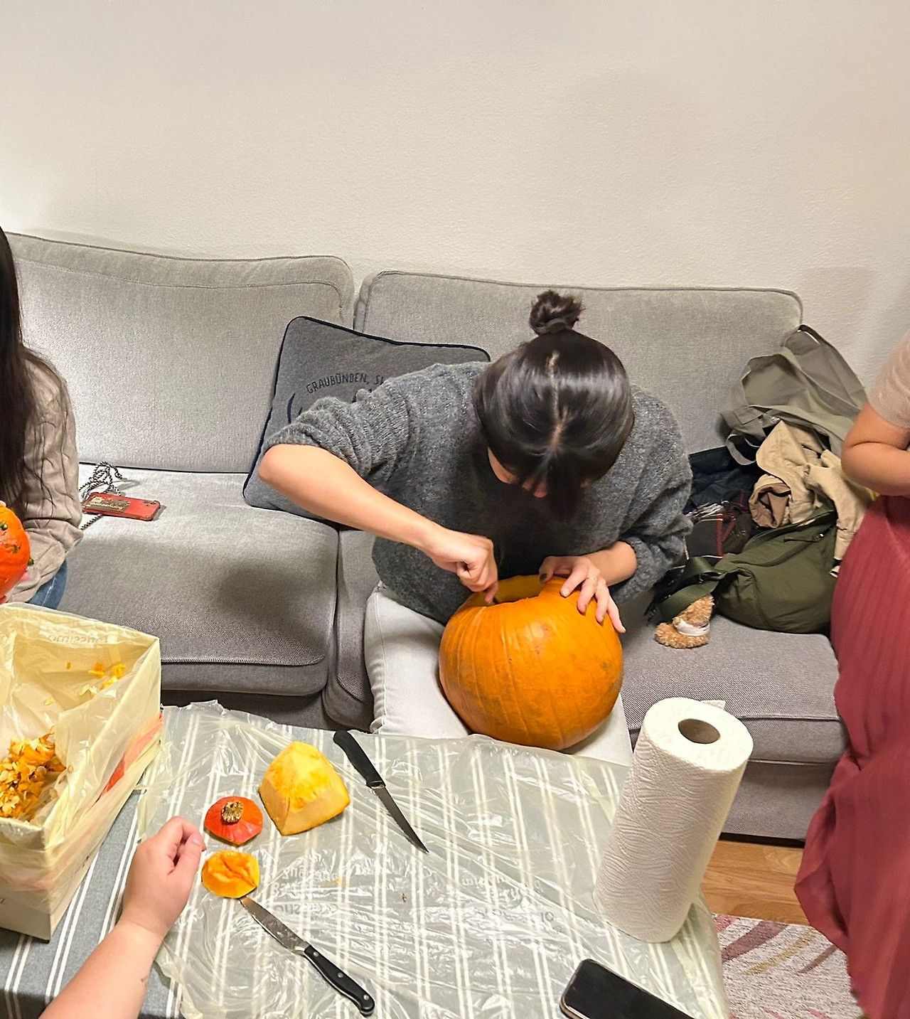 그래서 그날 만든 잭 오 랜턴을 쓰기엔 시간이 애매했다. 삔새와 진진과 마침 그 주 초에 우리 집에서 모이기로 해서 그날 우리 셋도 할로윈 음악을 들으며 호박을 열심히 팠다. 이번에 나는 아싸리 잭 오 랜턴이 과카몰리를 토하는 모습을 계획했어서 작은 호박이 토하는 표정을 만들었다.