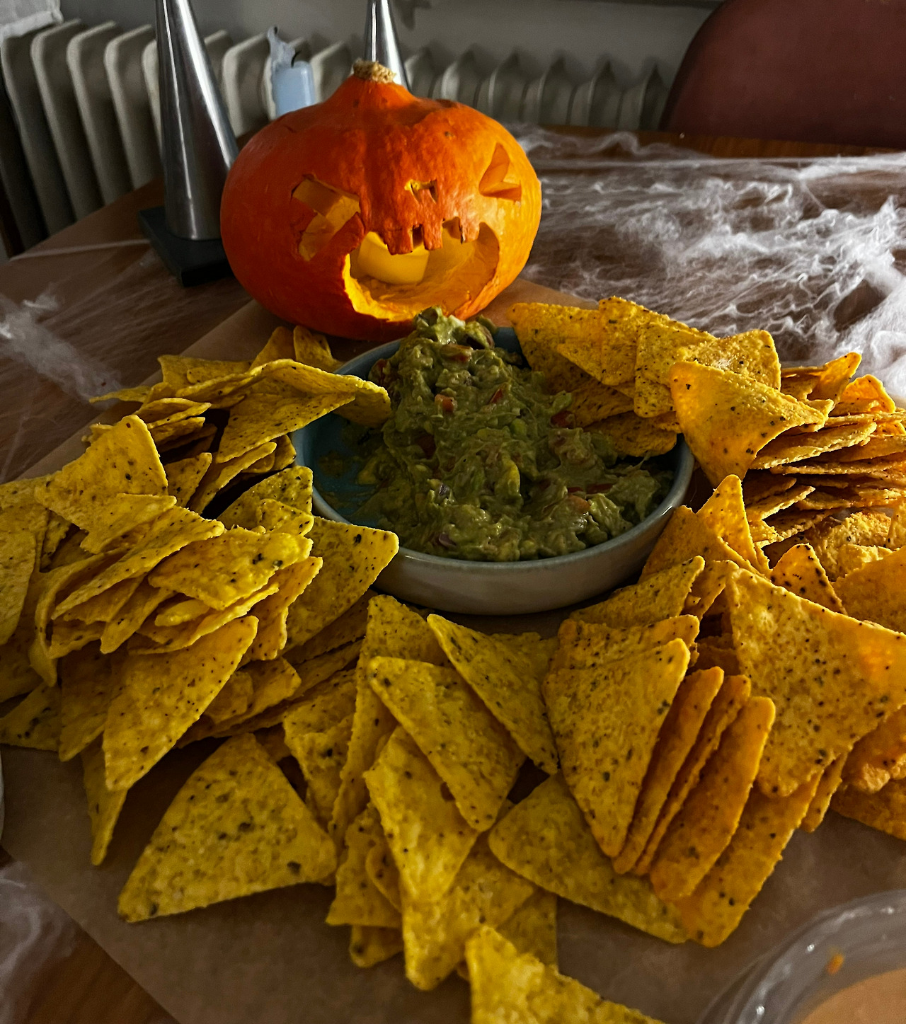 과카몰리는 전날 만들어 둘까 하다가 물이 생기거나 색이 변할까 걱정되어 당일에 만들었다. 아보카도만 잘 숙성된 걸 사면, 토마토, 양파를 후다닥 다지다시피 썰어서 레몬즙과 후추랑 같이 섞으면 과카몰리는 정말 어렵지 않게 완성된다. 원래도 비건인 과카몰리를 잭 오 랜턴 앞에 잘 놓은 다음, 비건으로 주의해서 산 또띨리아 칩스를 주위에 잘 뿌려놓으면 손쉽게 할로윈 분위기가 나온다. 다음에도 써먹을 예정이다.