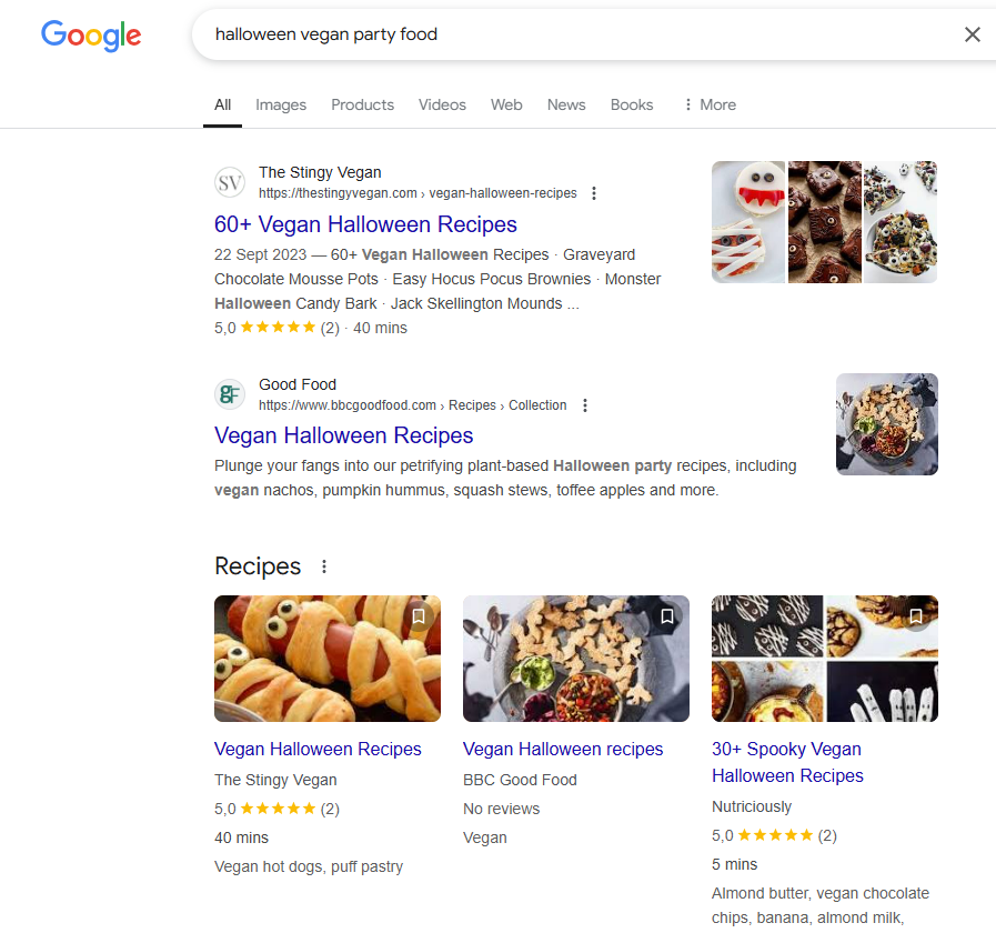"비건 할로윈 파티 음식"이라 검색하면 수만 가지의 레시피가 나온다. 썸네일에서도 보이겠지만 아쉽게도 절반 이상은 디저트류 베이킹이다.
