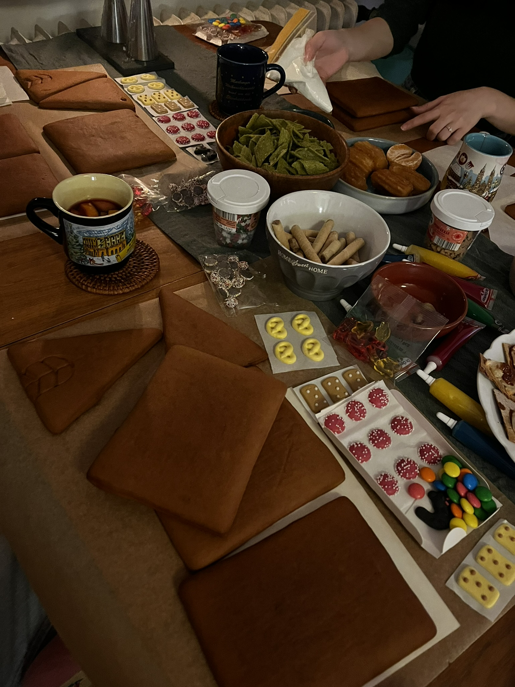 해를 거의 볼 수 없는 우울한 독일에 겨울이 시작되었고, 독일에서 그걸 견디는 방법은 마치 크리스마스를 기다리는 것이 유일한 듯하다. 9월부터 슈퍼마켓에서 크리스마스 관련 된 물건들을 찾아볼 수 있고 11 월이면 크리스마스 마켓이 열린다. 나도 그래서 친구들을 불러 모아 진저브레드 하우스를 꾸며 보기로 했다. 사실 소셜 미디어에서 당시 유행했던 걸 따라한 건 데, 같은 마음이었는지 친구들도 실컷 신나서 놀러 왔다.