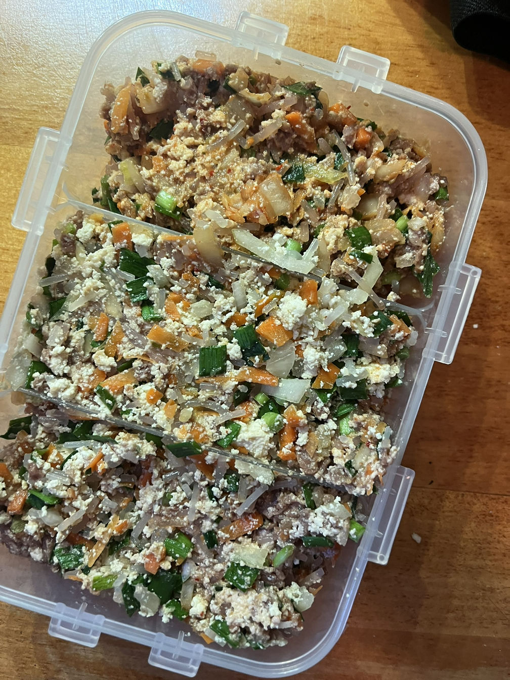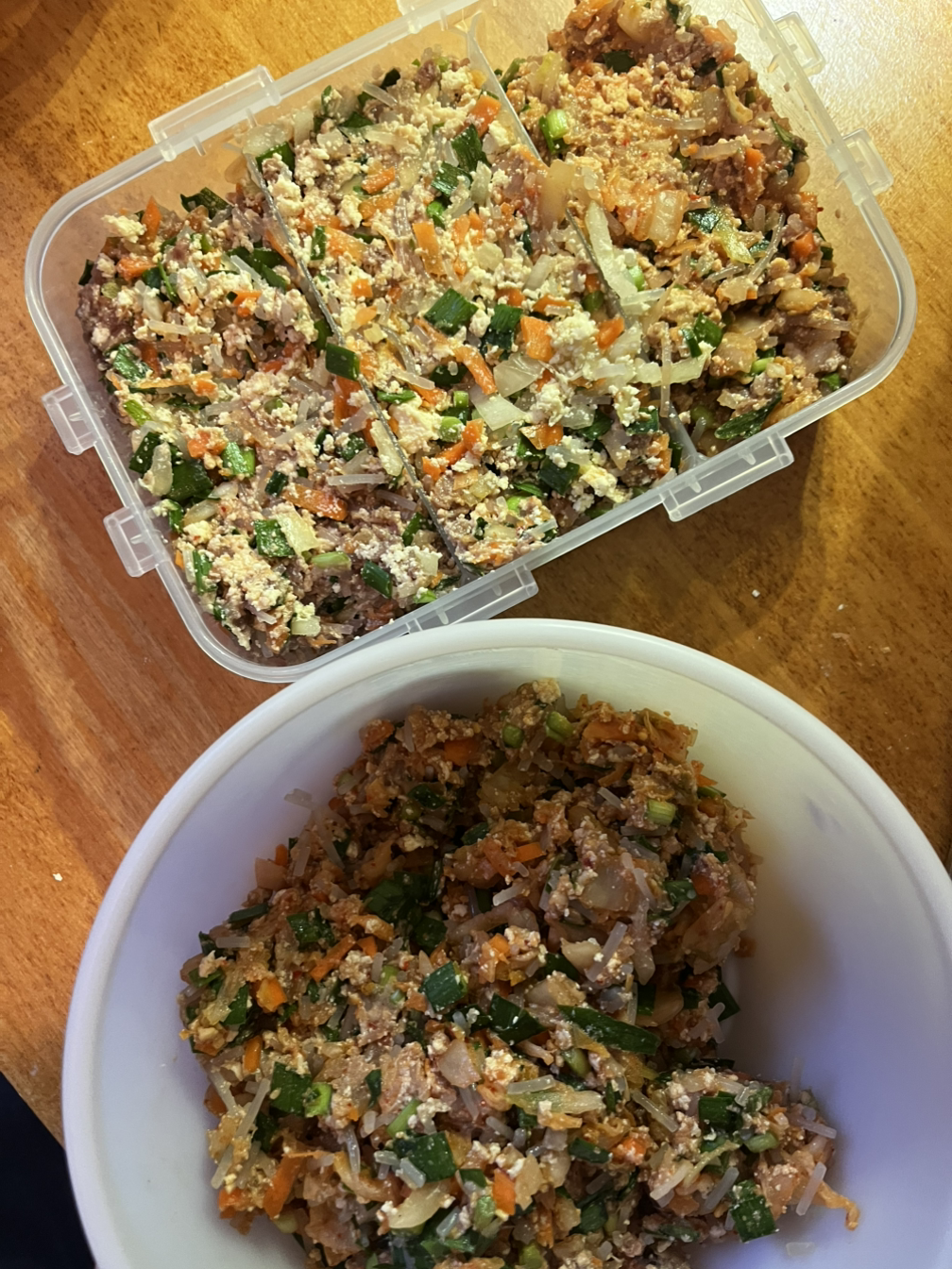 친구들이 오는 당일 아침부터 바쁘게 만두 재료를 준비하기 시작했다. 물론 피는 한인 마트에서 미리 냉동으로 사 두었다가 간단히 해동만 했다. 나는 뭐든 맥시멀리스트라 고기만두와 김치 만두를 둘 다 하고 싶었다 근데 그걸 또 비건과 논비건으로 나누니 총 4가지 종류의 속이 나왔다. 그러기 위해 고기뿐만 아니라 김치도 비건과 논 비건 김치로 사야 했다. 그렇다, 일반 김치는 비건이 아니다. 김치에 들어가는 액젓이 주원인인데 다행히도 종갓집과 비비고에서 간편하게 비건 김치를 판다. 특히 유럽에서는 아시아 마트에서 비건 김치를 찾아보기가 쉽다.