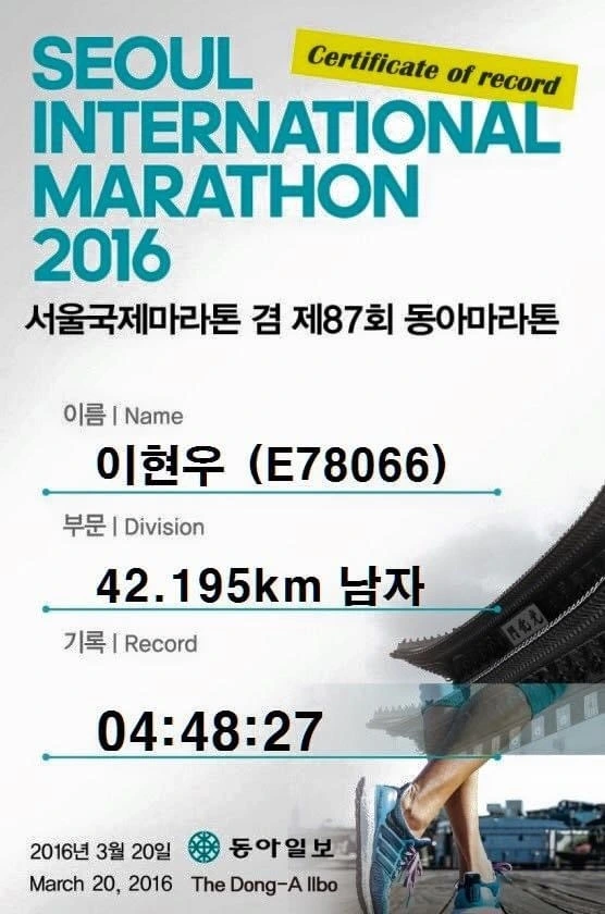 42.195km. 자동차로 1시간이면 충분히 도착할 거리다. 가만히 앉아서 이동할 수 있는 시대에 우리는 왜 땀 흘리고 때론 고통을 참아가며 마라톤을 하는 걸까. 저마다 각자 달리는 이유가 있을 테다. 나는 그저 마라톤 완주 경험 1회, 이 타이틀을 갖고 싶었다. 그럴싸하지 않은가?