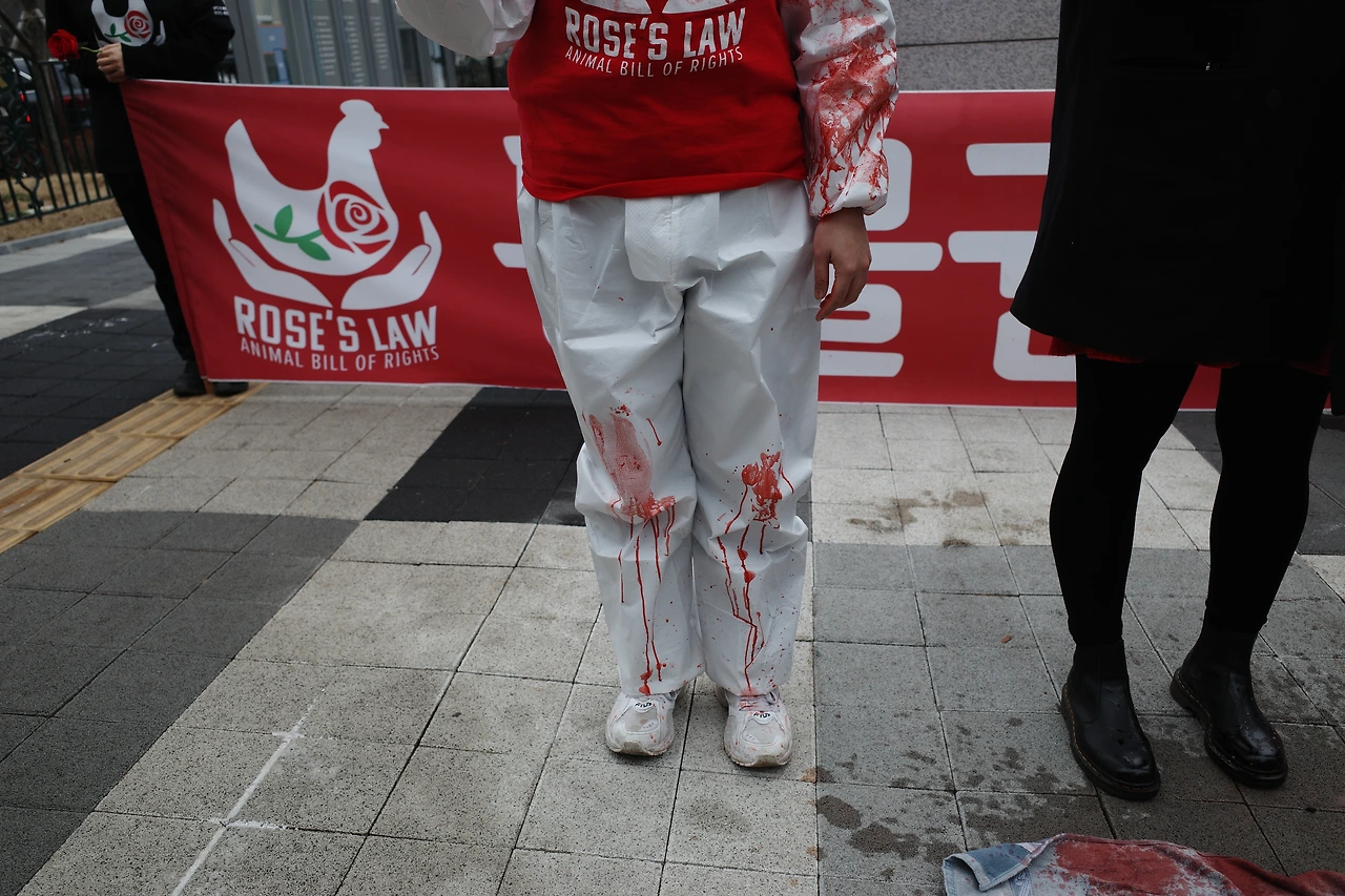 이후 퍼포먼스가 진행되었다. 한 활동가는 천칭에 동물의 피를 상징하는 빨간 물감을 쏟았다. 이내 천칭은 빨갛게 물들었고 천칭에서 빨간 액체가 뚝뚝 떨어졌다. 피가 뚝뚝 떨어지는 것 같은 퍼포먼스에 카메라 플래시가 터지기 시작했다.