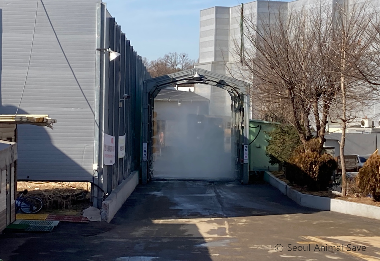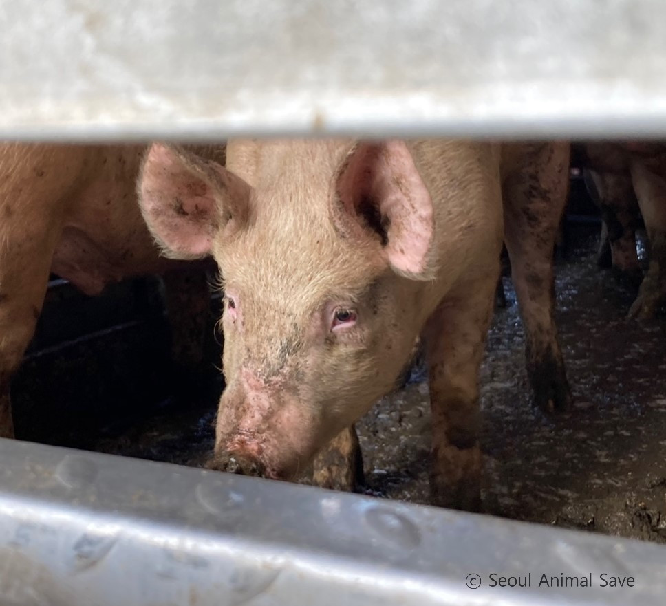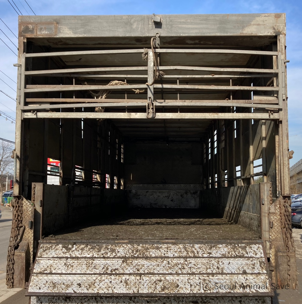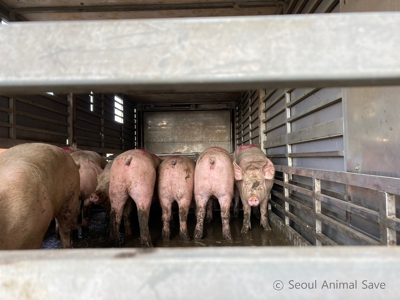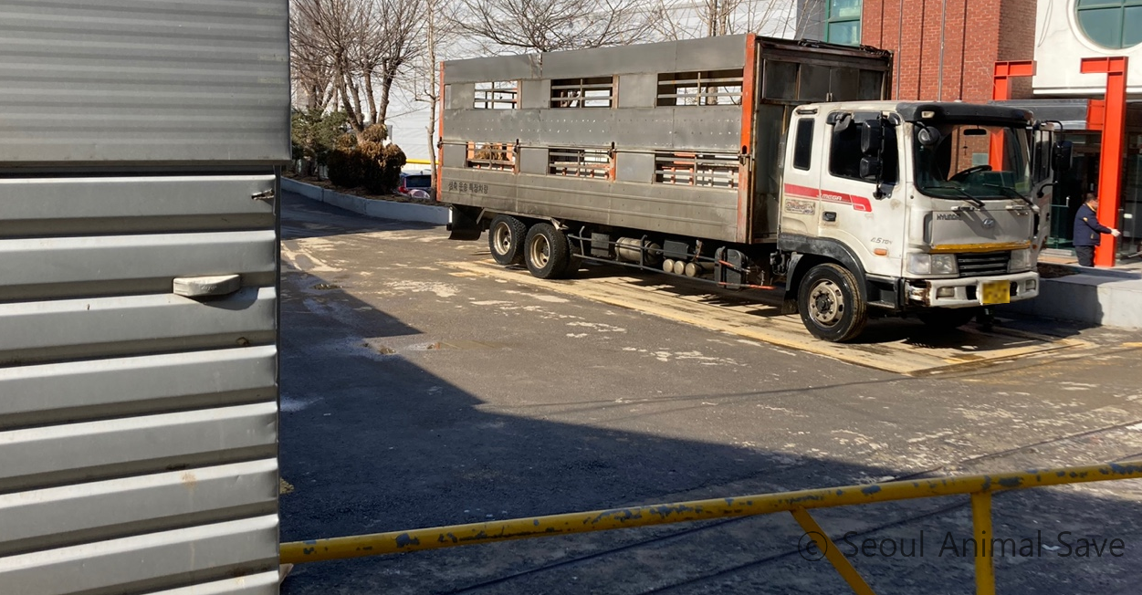 함께 온 활동가들이 트럭 뒤에 바짝 붙어서 물을 주었다. 물을 받아마시는 게 익숙지 않은지 바닥에 고인 오물 가득한 물을 핥아마셨다. 축산물 위생관리법 시행규칙에 따르면 돼지는 도축 전 12시간 이상 굶겨야 한다. 육질 향상과 내장 적출, 폐기물 처리비용 감소 등 여러 이유로 굶긴다. 사람이 대장내시경을 할 때 장을 비우는 것처럼 말이다. 과거 비질을 할 때에는 삶은 감자나 고구마를 주기도 했다고 한다. 지금은 물만 주고 있다. '빵빵!' 트럭은 안으로 들어가야 한다는 신호를 보냈다. 우리는 트럭에서 떨어졌다.