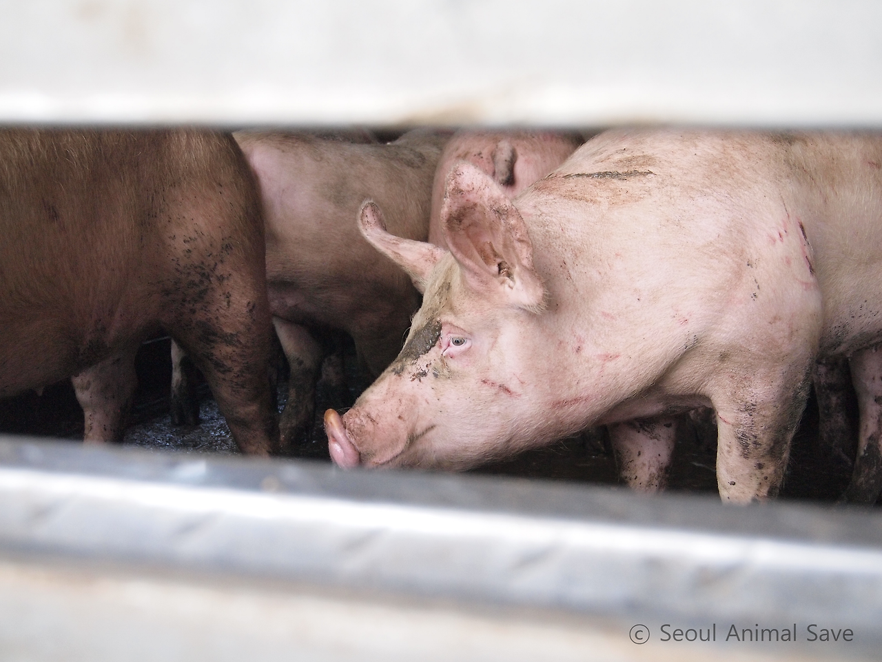 우리는 차도변에서 잠시 대기하는 트럭 안 돼지를 가까이에서 볼 수 있었다. 도살장에 온 돼지들은 대략 6개월령 정도 되는데 호기심이 많고 활동량도 많은 시기다. 천방지축 어린아이를 상상하면 된다. 어떤 돼지인지 자세히 보지 못했지만 트럭 속에서 돼지의 비명소리가 들렸다. 자리가 좁거나 어디가 아픈 것 같았다. 간혹 바깥공기를 들이쉬며 자신을 쳐다보는 인간동물에게 호기심을 보이는 녀석들도 있었다. 작은 틈 사이로 코를 내밀며 킁킁거렸다.