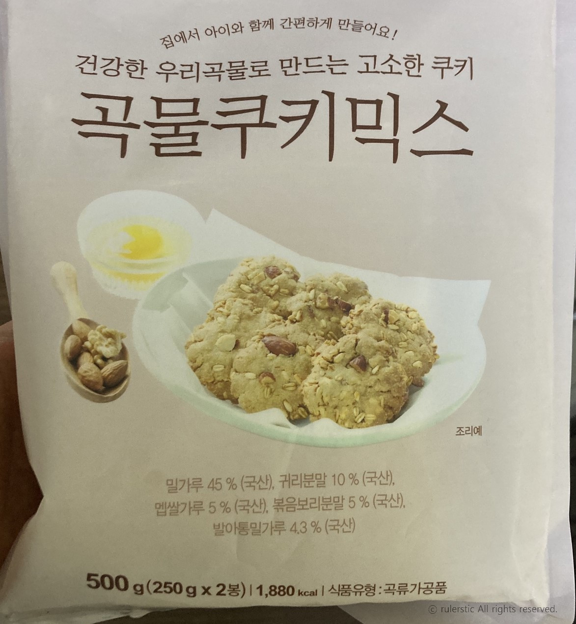 집에 돌아와서 제조법을 살펴보니 그리 어렵지 않았다. 바로 행동을 개시했다. 쿠키 믹스와 현미유를 4:1로 섞어준다. 현미유가 없어서 집에 있는 콩기름으로 대체했다. 식용유로 대체해도 무방하다. 추가로 아몬드와 호두를 잘게 잘라 섞어 주었다. 쿠키 믹스는 설탕이 섞인 채로 만들어진 상품이어서 굳이 설탕이나 올리고당을 추가하지 않아도 되지만 나는 기분이 한껏 좋아질 만한, 달달한 쿠키를 만들고 싶어서 올리고당을 넣어줬다. 취향에 따라 당도 조절을 하면 된다.