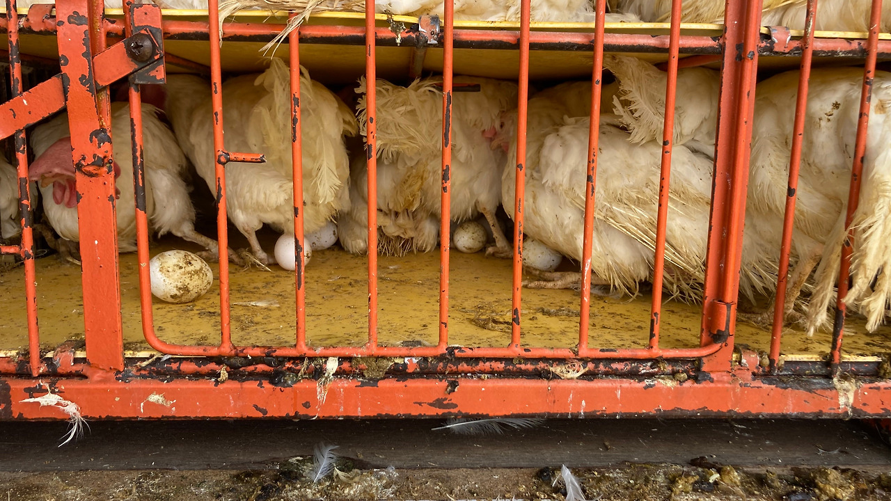 4.5톤 트럭에 약 3천 마리의 닭이 실려 있었다. 트럭에 실려 있던 닭은 평생 알을 낳는 강제노동을 하는 산란계였다. 무게는 약 1.7kg, 특대로 분류된다. 3천 명의 생명이 좁은 닭장에서 움직이고 소리를 지르는 모습은 마치 하나의 생명체처럼 보였다. 눈과 귀는 풍경과 냄새에 압도됐다.