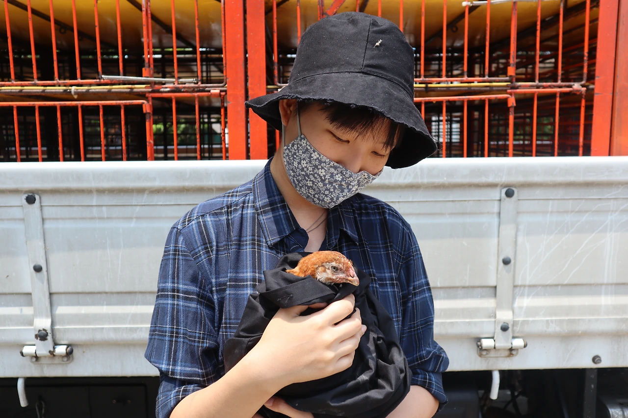 몸을 웅크려 트럭 밑에 들어가기도 하고 풀숲을 헤치기도 했다. 우릴 지켜보던 운송 기사는 보다 못해 닭을 잡을 때 사용하는 쇠막대기를 건네주는 친절(?)을 베풀어주기도 했다. 한 시간 가량 쫓고 쫓기는 상황이 반복되었다. '우리가 정말 닭을 구조할 수 있을까?'라는 의심이 커져갈 무렵, 트럭 바퀴 위에 올라간 닭을 혜린이 두 손으로 낚아챘다. 죽이는 손이 아니라 살리는 손이었다. 몇 번의 푸드덕 날갯짓 끝에 활동가 혜린 품에 안긴 닭은 삐약삐약 소리를 냈다. 우리는 옅은 웃음을 지으며 안도의 한숨을 내뱉었다.