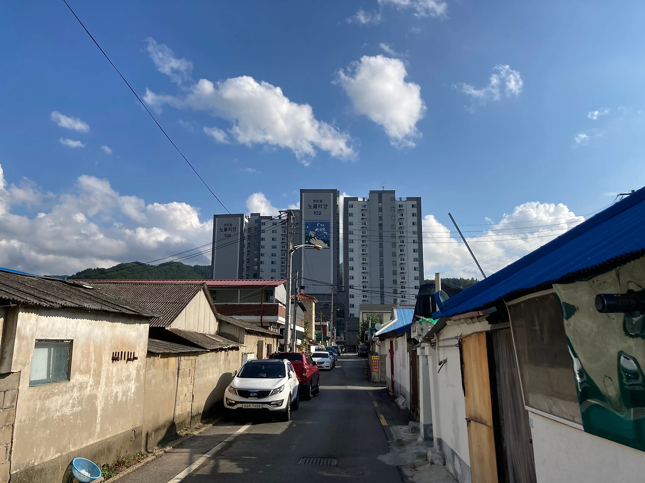 무주읍은 인구가 1만 명이 되지 않는 작은 도시다. 열 손가락으로 아파트 숫자를 셀 수 있을 만큼, 고층 건축물의 숫자도 적은 도시다. 사실 ‘도시’보다는 ‘동네’라는 말이 어울리는 작은 읍이다. 추석 명절에 무주읍 내를 걷던 중 숨이 턱 막히는 순간이 찾아왔다. 1~2층의 주거용 건축물과 상가건축물이 대부분인 도로변에 높게 솟은 15층짜리 주상복합건축물이 내 눈동자를 덮었다. 믿을 수 없었다. 과거에 도로 너머로 보였던 푸른 산은 가로막혀서 보이지 않았다.