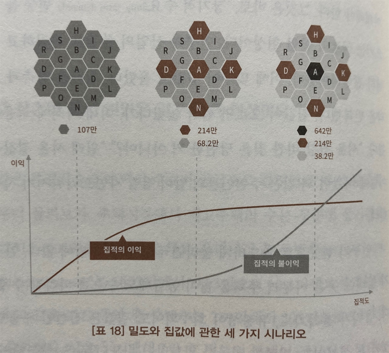 수도권 쏠림 현상이 어떻게 집값을 끌어올리는가? 책 <부동산, 누구에게나 불공평한 불행>은 밀도와 집값에 관한 세 가지 시나리오를 제시한다. 시나리오 1은 가구 수가 골고루 분포되어 있고 시나리오 2는 5개의 지자체의 밀도가 높아진 상태다. 시나리오 3은 국토 전반의 쏠림 현상이 심화된 상태다.