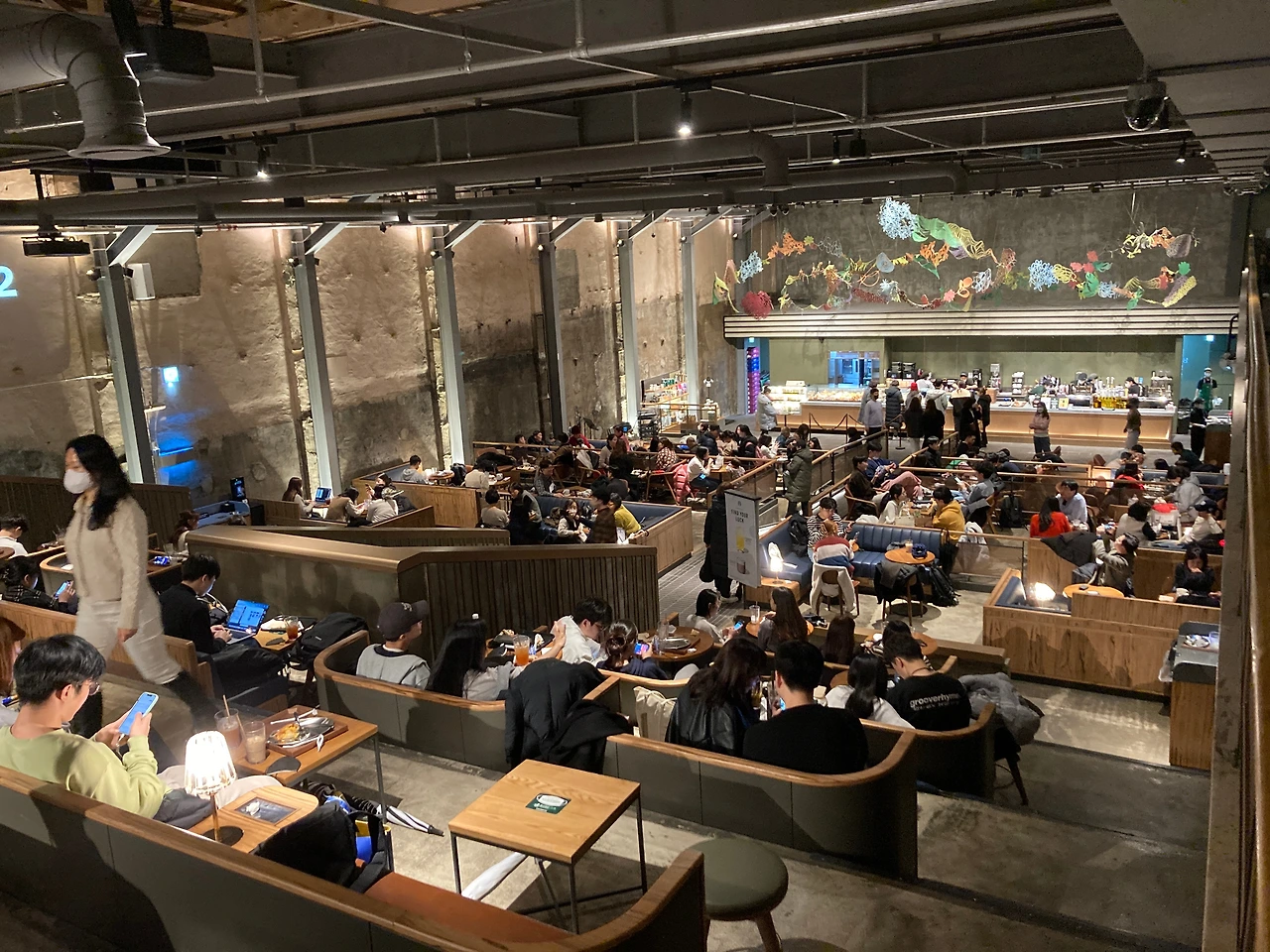 인파가 몰릴 것으로 예상되는 주말을 피해 평일 오후에 방문했다. 예상과 달리 평일 오후에도 넓은 카페 안은 만석이었다. 경동1960점은 천장과 벽면 마감을 벗겨내어 천장 구조와 콘크리트 벽면이 그대로 드러난다.