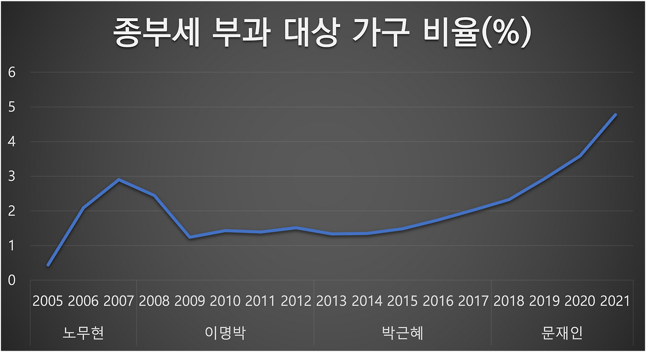종부세는 중산층 세금이라고 하기엔 굉장히 적은 사람들에게 부과되는 세금이다. 위 표는 2005년 노무현 정부부터 2021년 문재인 정부까지 종부세 부과 대상 가구 비율을 나타낸 표다. 5%를 채 넘지 않는다(이는 가구 기준이기 때문에 1인 기준으로 한다면 비율은 더욱 낮아진다).