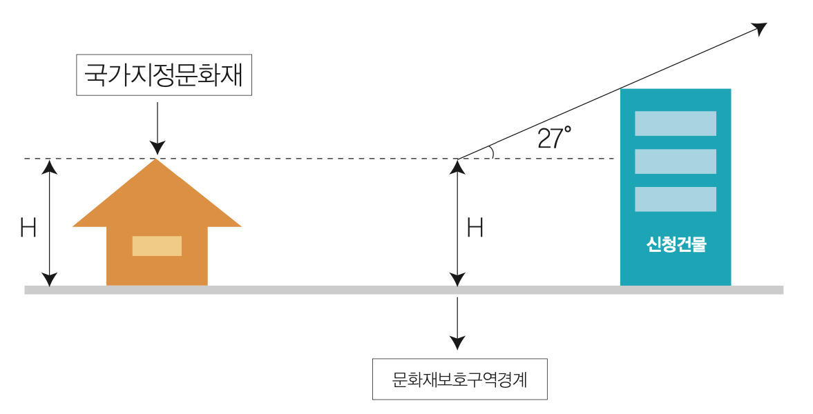 예를 들면 종묘 문화재 경계면에서 100m 떨어진 곳에서 건축 행위를 할 때, 건축물의 높이는 53.2m다. 100m의 1/2에 해당하는 50m에 종묘의 높이 3.2m를 더하면 건축 가능한 높이가 나온다. 건축법 상 1층 높이를 4m로 계산하면 13층 정도 된다.