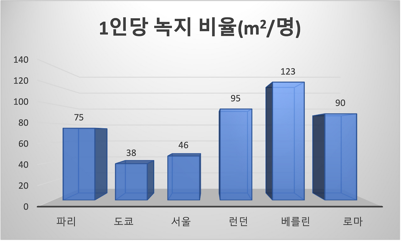 실제로 서울시 녹지는 매우 부족한 편이기도 하다. 서울시 자료에 따르면 전체 면적 대비 녹지 면적 비율이 뉴욕 맨해튼은 26.8%, 센트럴 런던은 14.6%이지만, 서울 사대문 안은 3.7%에 그친다. OECD 통계(2021)를 봐도 서울시 1인당 녹지비율이 낮은 편이다. 서울시가 산으로 둘러싸인 도시라는 점을 고려하면 도심지 내 녹지 비율이 현저히 낮다는 걸 알 수 있다.