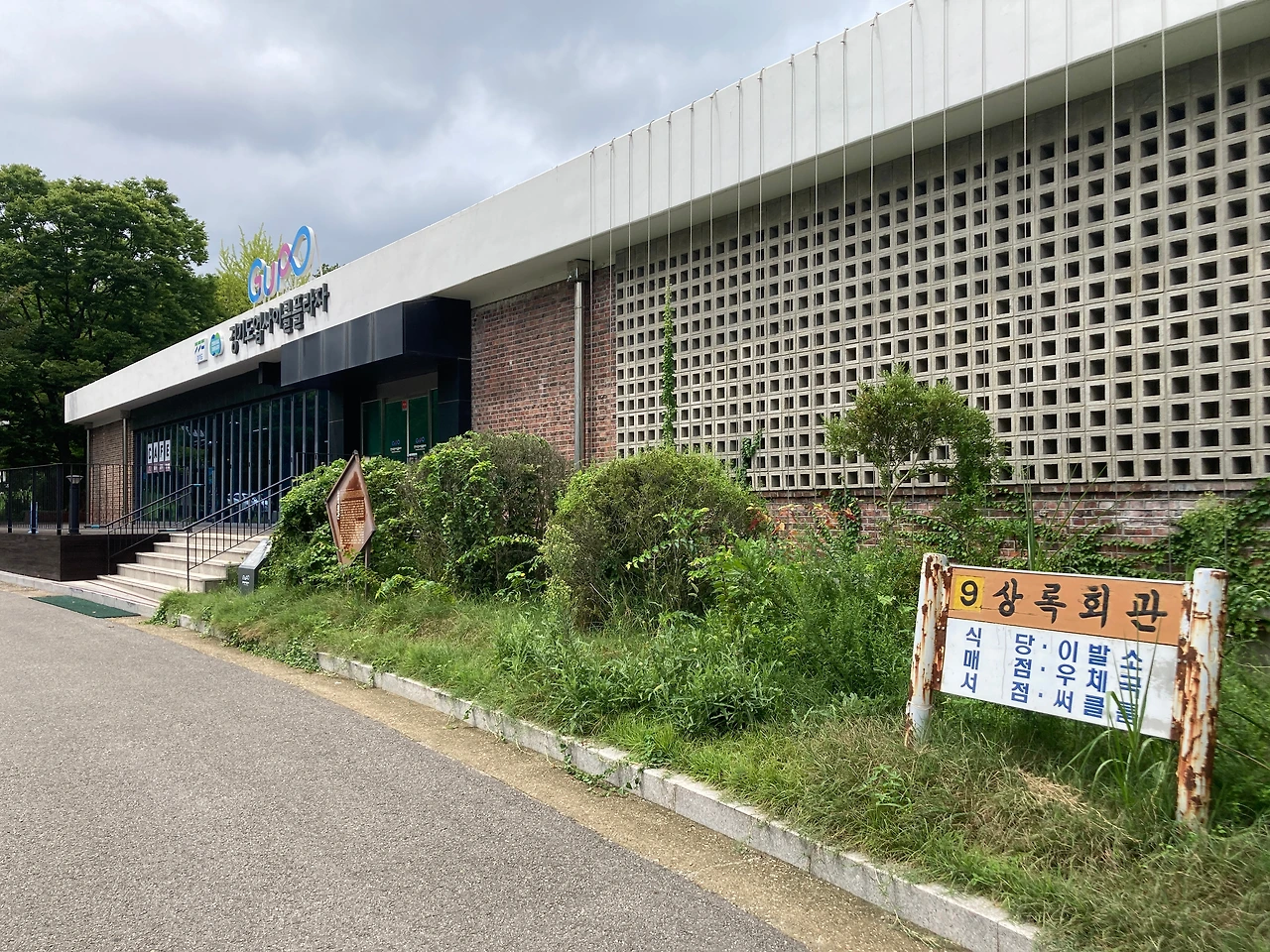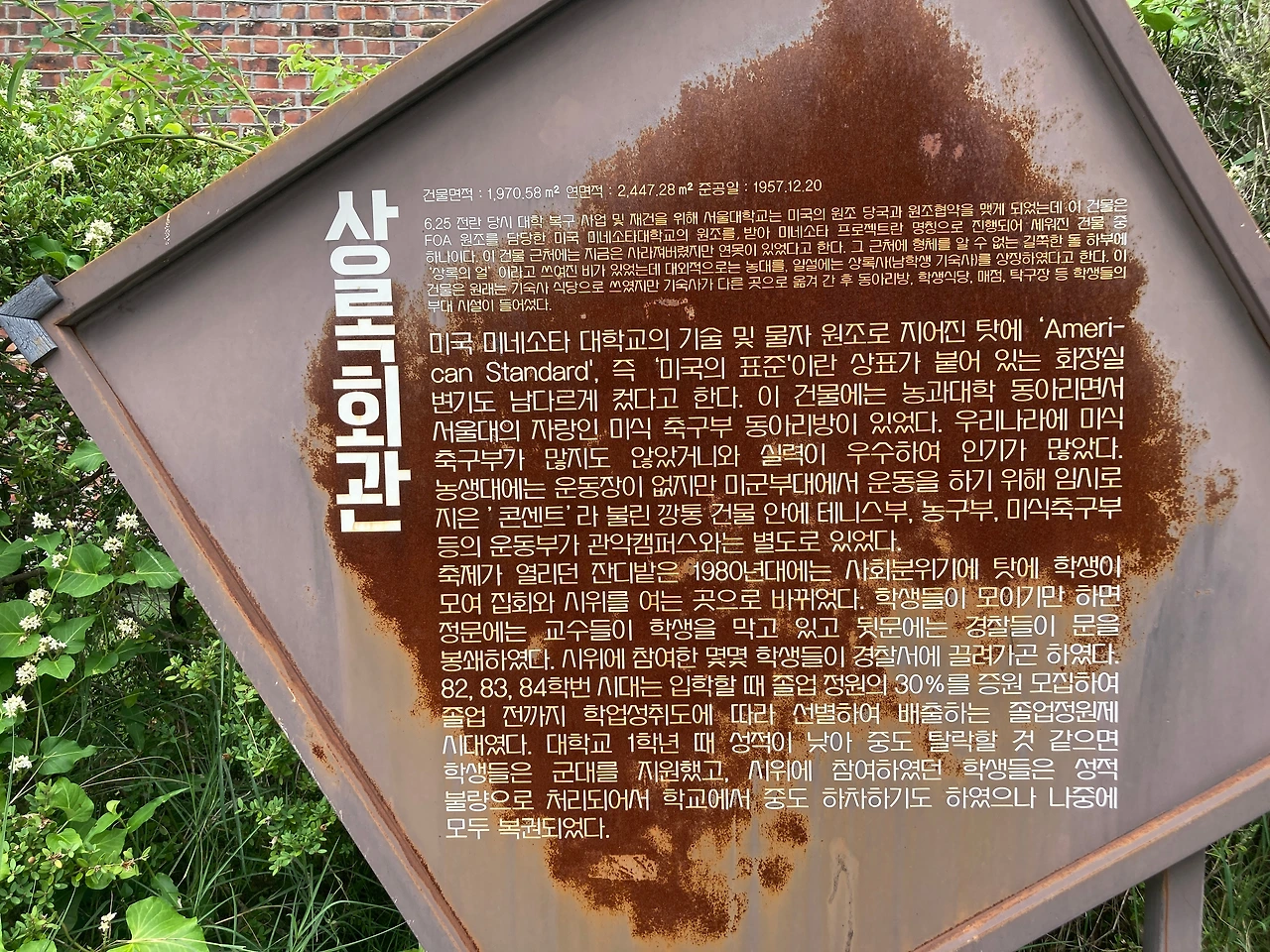 업사이클센터의 건립 취지에 맞게 공간을 업사이클했다는 점이 특별하다. 옛 서울농생대 상록회관을 리모델링하여 지어진 건물이다. 입구 한편에는 서울대 농생대 시절의 녹슨 상록회관 입간판이 지나온 시간을 말해준다.