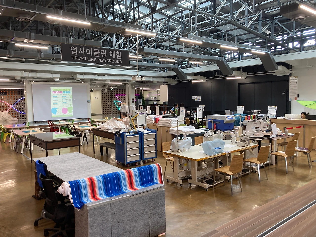 내부 중앙에 있는 '창작의광장'은 시민들이 직접 체험하고 업사이클링 활동을 할 수 있는 공간이다. 미싱 기계와 섬유 프린터가 구비되어 있다. 간단한 교육을 이수하면 장비를 사용할 수 있다. 장비와 공간 구성은 메이커스페이스와 유사했다. 창업을 준비하는 이들이 시제품을 만들어보는 것도 가능하다.