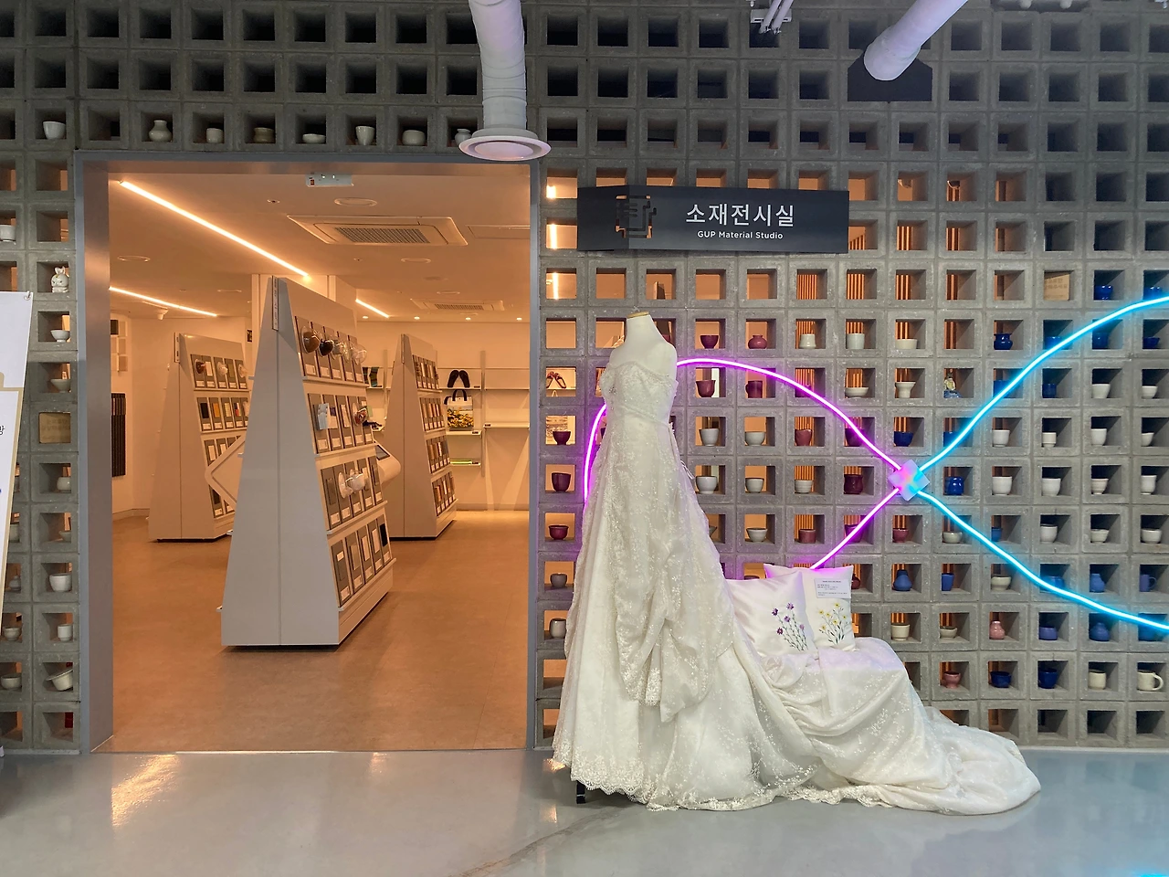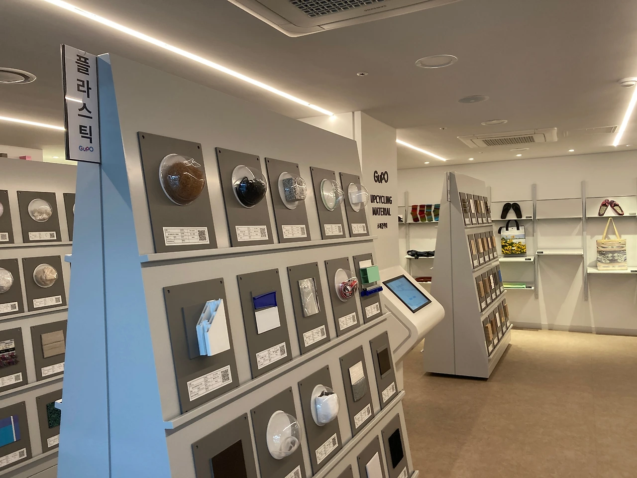 플라자에서 특별했던 공간은 '소재전시실'이다. 업사이클 재료를 전시해 둔 곳이다. 업사이클 재료를 활용해 제품을 만들고자 하는 개인 혹은 기업과 업사이클 재료를 공급하는 기업을 연결해 주는 전시실이다. 업사이클 창업에 관심 있는 이들은 다양한 아이디어를 떠올리고 아이템을 찾는 장소가 될지도 모르겠다.
