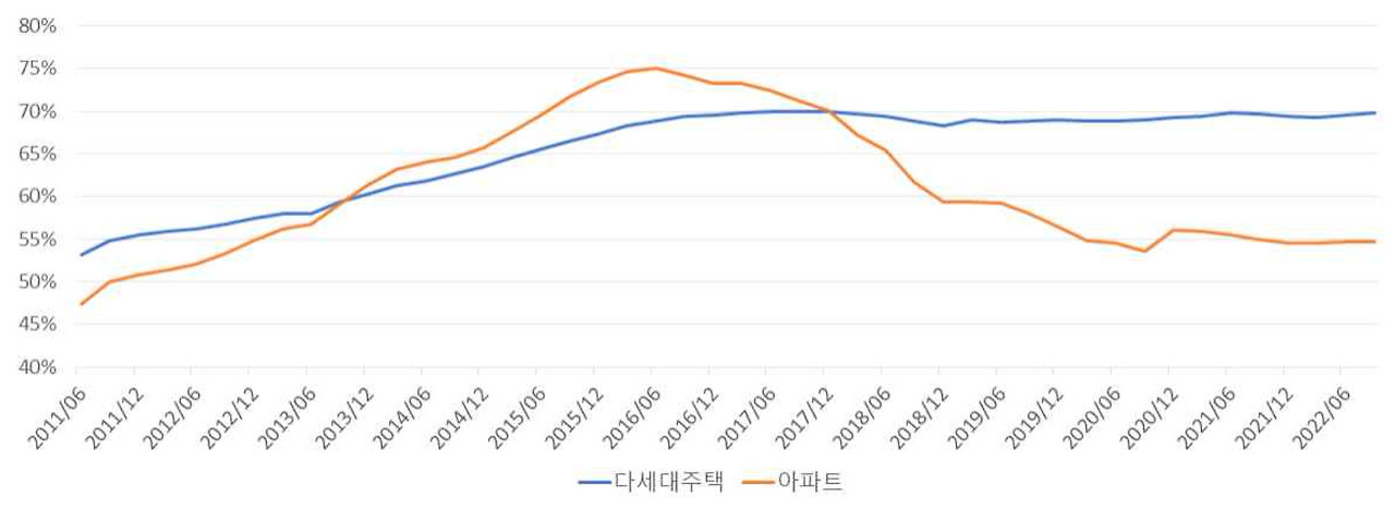 깡통전세는 전세가율이 높은 아파트보다는 빌라라고 부르는 다세대주택이나 다가구주택에서 발생한다. 아파트 전세가율이 하락하는데도 다세대주택의 전세가율은 떨어지지 않았다. 부동산 시장이 활황기에 접어들어도 아파트는 매수 수요로 전환되지만, 다세대주택은 임차 수요로 여전히 머물기 때문이다.