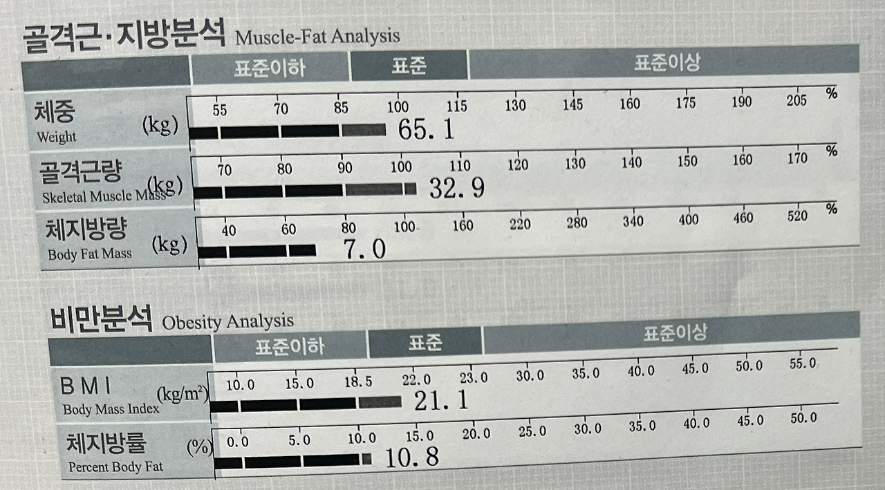 육식하던 때와 근육량은 크게 차이가 없다. 오히려 체지방률은 10%로 낮은 편이다. 육식하던 때보다도 낮은 수치다. 낮은 체지방률은 성실하게 운동해서 얻은 덤이다.