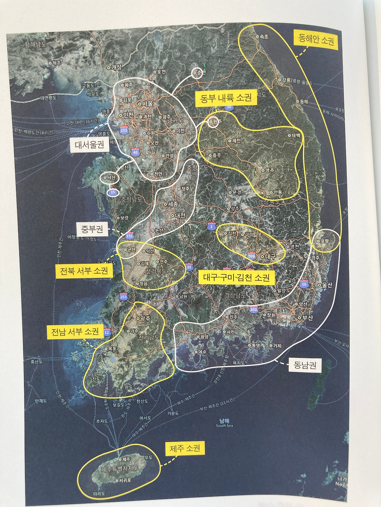 책 <한국 도시의 미래>는 대한민국 도시를 3개의 메가시티와 6개의 소권역으로 구분했다. 인상깊었던 건 메가시티를 단순히 행정구역 단위의 결합 형태로 본 것이 아니라 교통망과 산업권에 따라 구분한 것이다. 도시민은 단순히 행정구역 내에만 머무르지 않고 생활하기 때문이라고 말한다. 필자의 고향 무주가 대표적인 사례이며 책에 나온 강원도 철원도 수도권 메가시티 권역에 속하는 사례다.