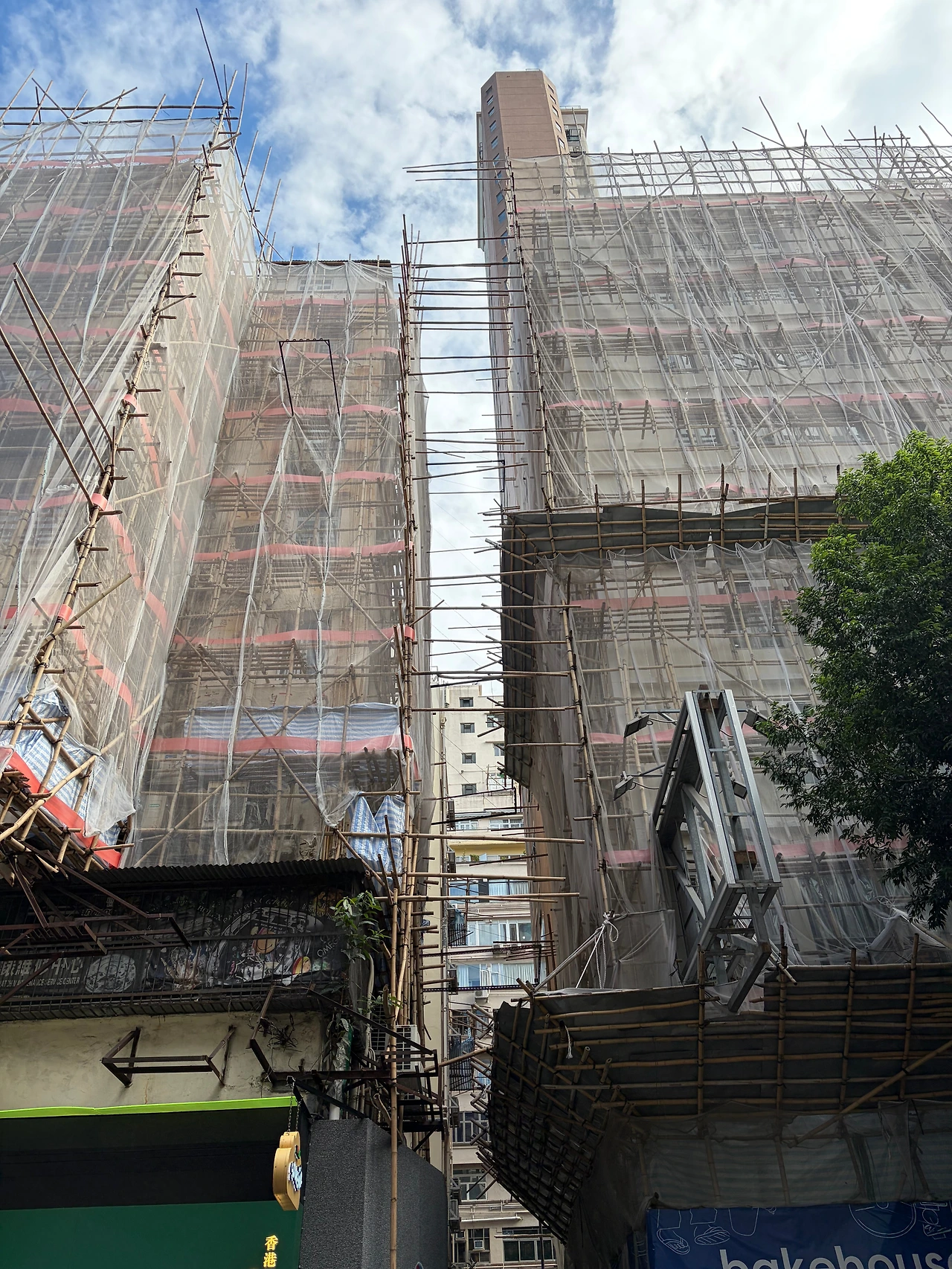 구룡반도 도심부에는 노후화된 건축물이 많기 때문에 외벽 보수 공사를 위해 대나무 비계를 사용하는 경우가 많았다. 홍콩 거리를 돌아보면서 놀랐던 점은 신축하는 현장에서도 쉽게 관찰할 수 있었고 딱 봐도 높은 건축물임에도 대나무 비계를 사용한다는 점이었다. 오히려 대나무가 강관에 비해 가볍기 때문에 설치가 용이하고 속도도 훨씬 빠르다고 한다.