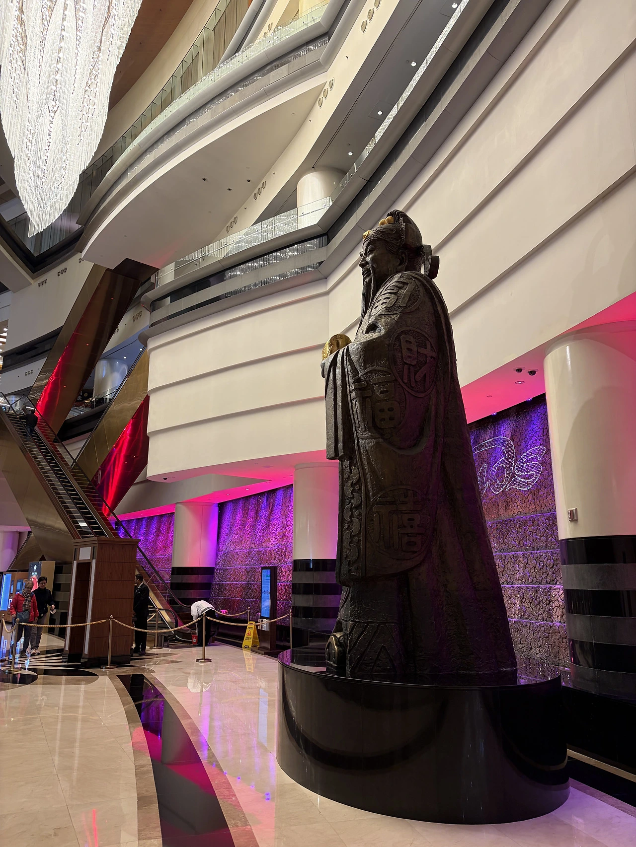 1층 로비에는 부와 번영을 상징하는 재신상이 있다. 마카오의 건축물이 그렇듯 동상도 어마어마하게 크다. 아마도 몇몇은 에스컬레이터를 타고 카지노가 있는 2층으로 가면서 재신상을 바라보며 간절히 빌지도 모른다. 과연 재신상은 이곳에 방문하는 이들에게 재물의 운을 가져다줄까? 아니면 카지노를 만든 이에게 재물을 가져다주는 신일까?