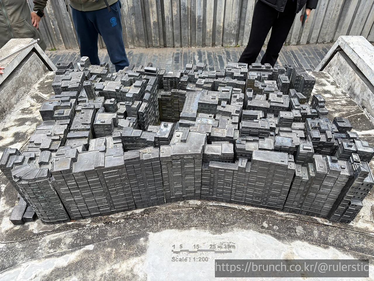 공원 중앙에는 구룡성채에 관한 작은 전시관이 있다. 전시관 입구에 과거 구룡채성의 모습을 1:200으로 압축해 놓은 모형이 있다. 모형으로만 봐도 숨막히는 밀도다.