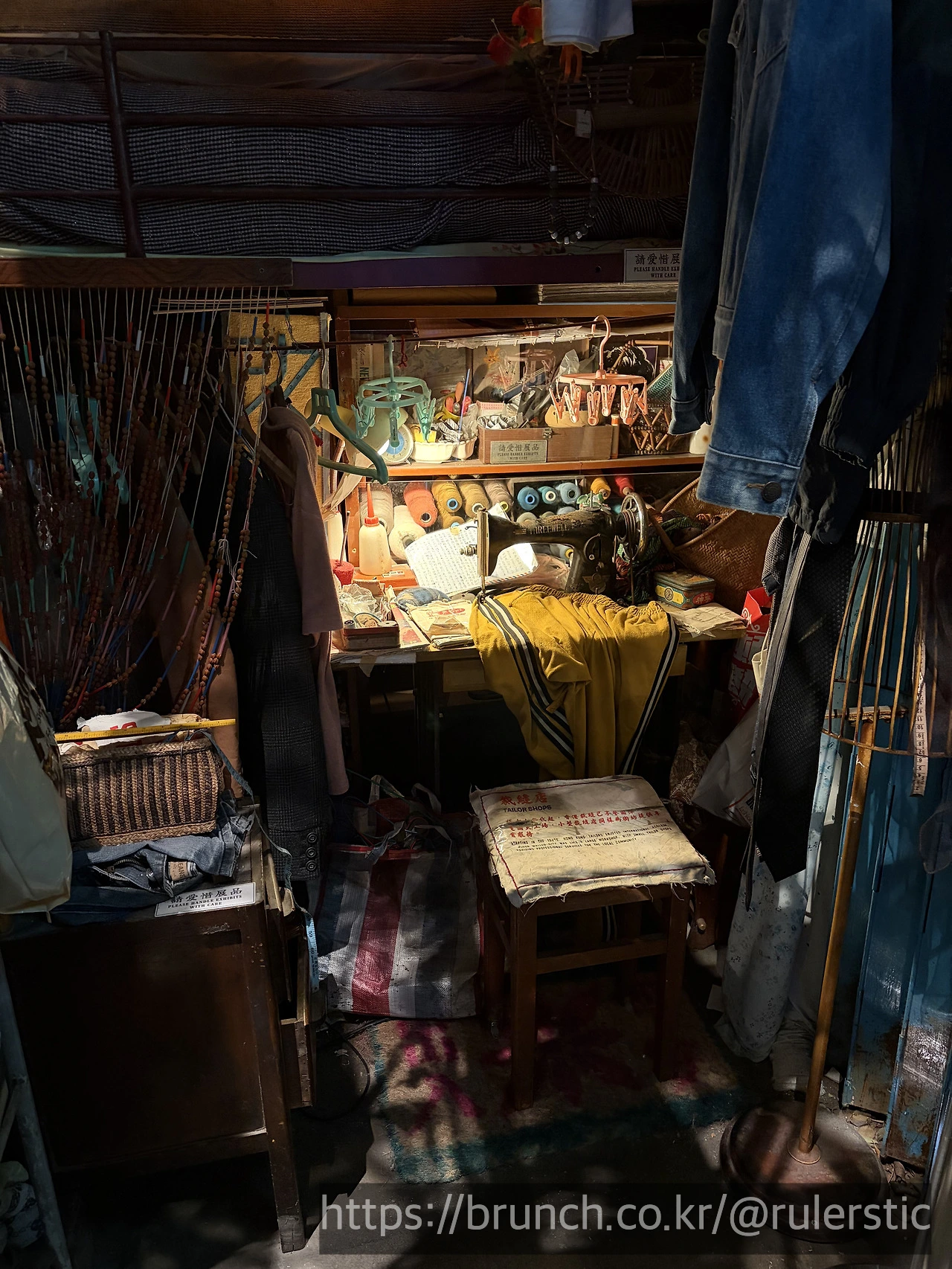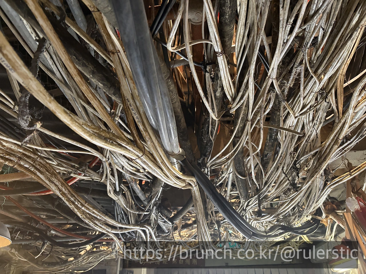 건축 현장에서 일해본 사람 입장에서 가장 신기했던 건 재현된 전깃줄이었다. 전깃줄은 이곳이 과거에 어떤 공간이었는지 가장 실감 나게 보여준다. 건물이 누더기옷처럼 겹겹이 위로 옆으로 증축되면서 전기도 증설되면서 어디서도 볼 수 없는 광경이 만들어졌다. 도대체 수리는 어떻게 한 걸까. 누전으로 인한 화재로 건물이 소실되지 않은 것도 의문이다.