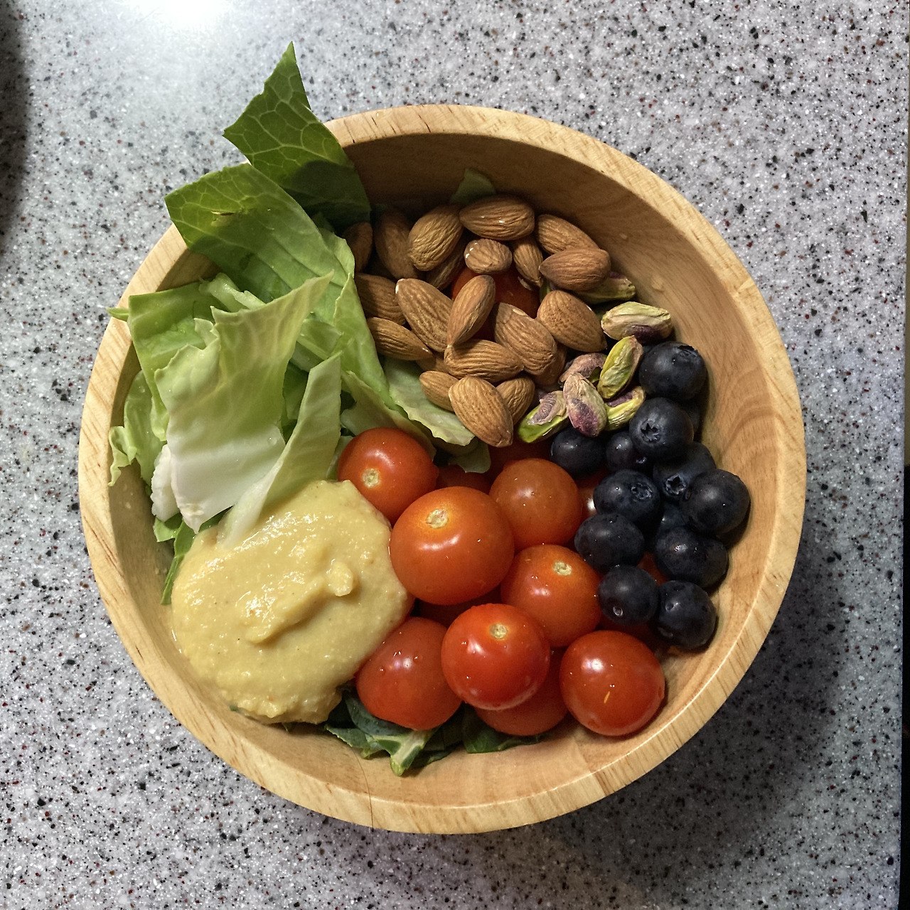 요즘 새로운 비건 요리를 발견하고 하나씩 요리해보는 재미가 쏠쏠하다. 최근 동물권 모임에서 후무스라는 음식을 알게 되었다. 병아리콩을 물에 불려 삶은 후에 깨와 소금 그리고 올리고당을 넣어 믹서기에 넣고 갈아낸다. 농도 조절에 실패했지만 세상에 하나밖에 없는 나만의 묽은 후무스를 완성했다. 후무스는 기존에 먹던 버무림 식단과 곁들여 먹는다. 블루베리와 방울토마토의 새콤달콤한 맛과 톡톡 터지는 식감은 후무스의 진하고 구수한 맛을 중화시켜준다. 버무림은 식후 잔반이 없고 설거지가 간단하기에 여러모로 완벽한 한 끼다.