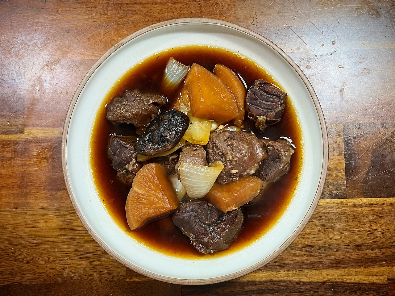 3. 위의 소스에 통후추 크게 다진것, 다진파, 다진 마늘 4스푼, 참기름 2스푼(빼먹었네?)을 넣고 준비해 둔 고기와 표고 버섯, 무를 넣고 2시간(사태기준. 진갈비살이면 1시간이면 될 듯) 끓이며 중간중간 기름과 찌꺼기를 제거해준다. 양파는 완성하기 10분 정도 전에 넣어주고, 양파의 숨이 죽으면 꽈리고추를 넣어 마무리.