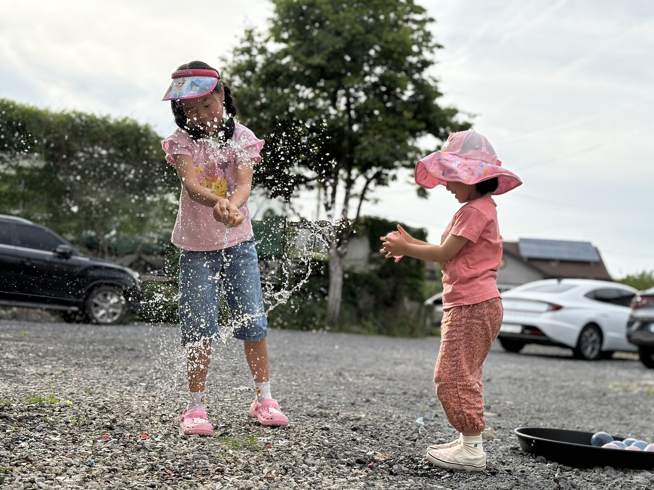 아이들과 집 앞 공터에서 물풍선을 잔뜩 터뜨렸다.