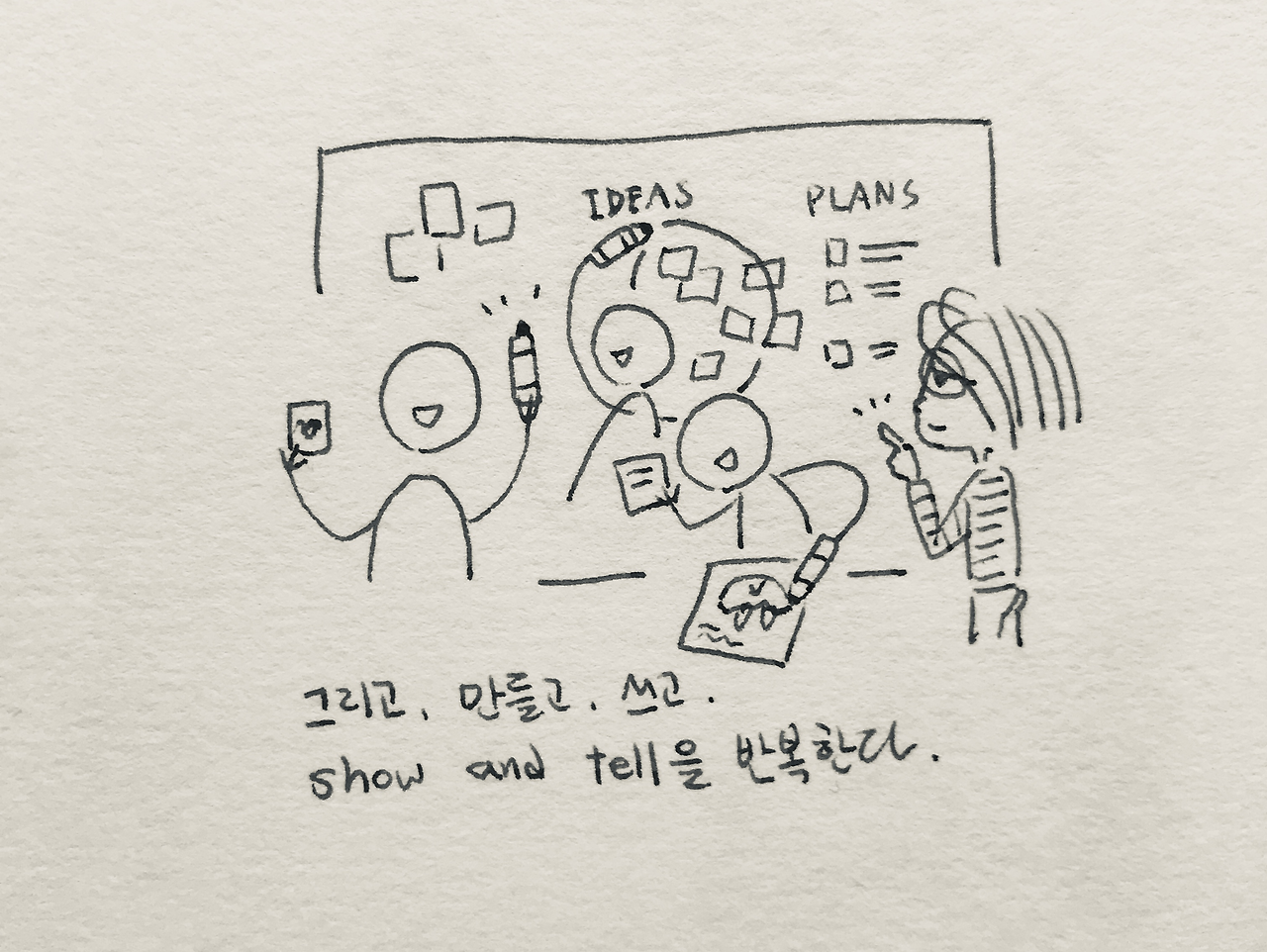 모두의 생각을 이해하기 위해서, 쓰고, 그리고, 끊임없이 사람들의 생각을 꺼내서 다른 사람들 앞에 보여주고 말하는 활동을 반복한다. 이 과정을 show and tell이라고 부른다. 신기하게도, 초반에는 달랐던 생각들이 점차 회를 거듭하면서 비슷해지고, 수렴해서 모두가 동의하는 스프린트 목표가 정해진다.