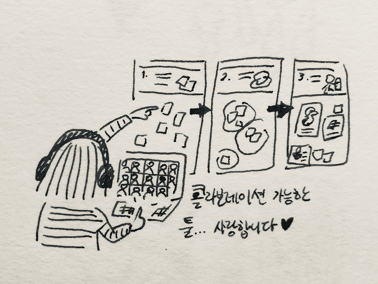 워크숍을 할 때는 커다란 미팅룸을 빌려서 방 안을 온통 포스트잇과 스케치로 덕지덕지 덮어가며 서로의 아이디어에 살을 붙이는데, 원격으로 스프린트를 하니까 이 부분을 해결하는 것이 숙제였다.