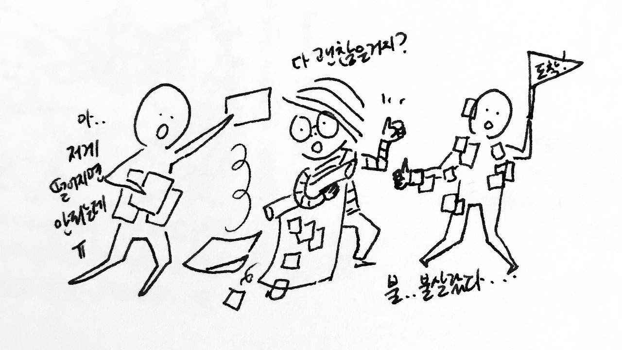 이번 디자인 스프린트를 진행하는 프로젝트는 한 번도 같이 일해본 적이 없는 디자이너들과 팀을 짜서 진행하다 보니, 초반에 스프린트 계획하는 과정에서 어? 어라? 갸우뚱하면서 합이 안 맞는 상황을 마주쳤었다. 짧은 일정이 개발팀의 스프린트와 연계되어 있는 바람에, 디자이너들끼리 잘 맞는 부분이 있어도 일단 디자인 스프린트를 계획한 대로 마감하는 것에 집중해서 마구잡이로 달렸다.
