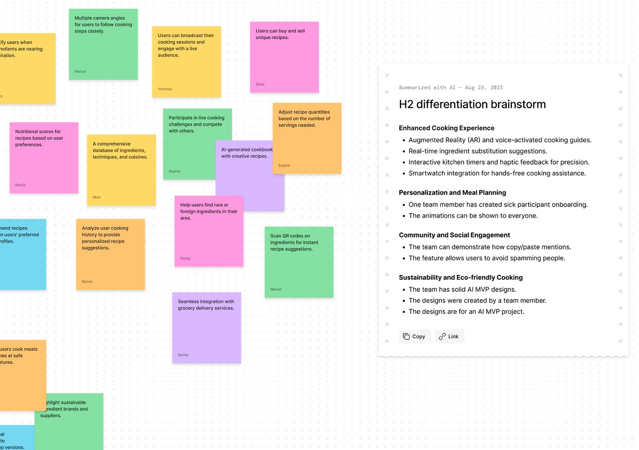 카테고리로 묶어주는 것보다 한 단계 더 업그레이드된 결과물을 얻을 수 있는 기능도 있다. 여기저기 흩어져있는 포스트잇 노트들을 전부 선택하고, 클릭 한 번만 하면 선택한 노트 중심의 요약 노트를 만들어줬다. 퀄리티는? 읽어보니 60% 정도는 쓸 만했다. AI 베타 기능이 완벽하지는 않지만, 작업 속도를 빠르게 단축시켜 준다는 게 꽤 마음에 들었다. 한 가지 아쉬운 점은, AI 베타 기능을 사용하는 것에 동의하지 않은 회사 계정은 위의 경험을 하나도 해 볼 수가 없다는 점이다. AI가 회사 업무 내용에 투입되는 것을 민감하게 생각하면, 위의 기능을 업무에 적용할 수 있도록 승인이 날 때까지 기다려야 한다.