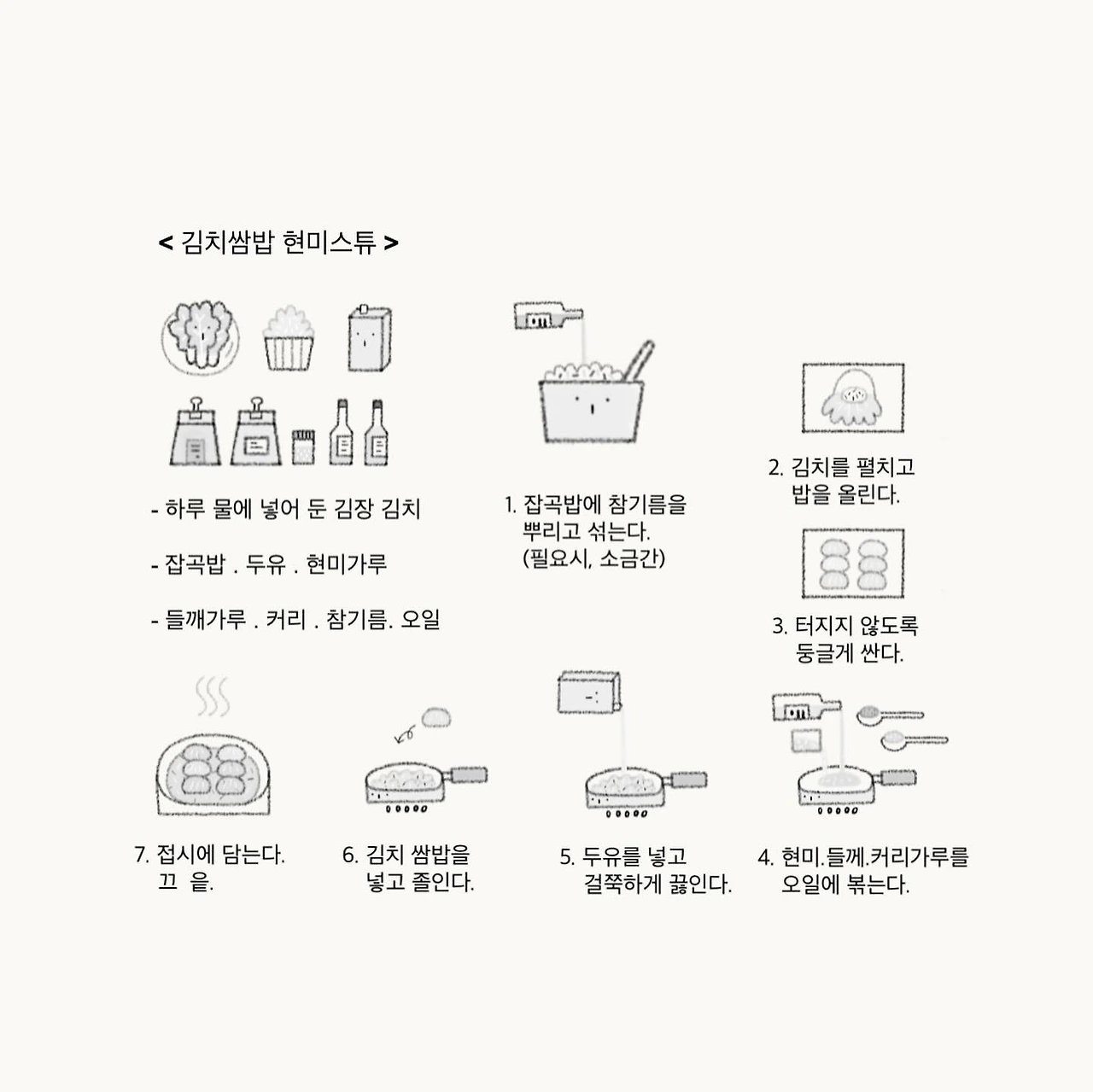 이야기를 하다 보니 너무 멀리 간 거 같다. 다시 돌아와 만드는 법을 설명하고 마무리할까 한다. 우선 물기를 뺀 김치잎을 준비하고, 간장 조미된 소고기와 잡곡밥을 잘 섞는다. 너른 접시(도마 꺼내기 귀찮기 때문.)에 김치잎을 잘 펼친 뒤 숟가락으로 밥을 응축시켜 올리고, 아기 포대기 싸듯 터지지 않게 여며준다. 참고로 아기 포대기를 싸본 적이 없다. 현미와 들깻가루 커리를 팬에 넣고, 오일을 두른 뒤 볶아서 루 비슷한 걸 만들고, 두유를 넣어 걸쭉한 농도가 될 때까지 바글바글 끓여준다. 어느 정도 스튜가 완성되면 먼저 만들어 둔 포대기 쌈밥을 차례로 입수시키고, 잔잔한 콧노래를 불러줘 가며 소스가 잘 배도록 젓가락으로 하나하나 동글려 준다. 끝으로 나는 넣지 않았지만 취향에 따라 치즈를 뿌려도 좋을 듯하다.