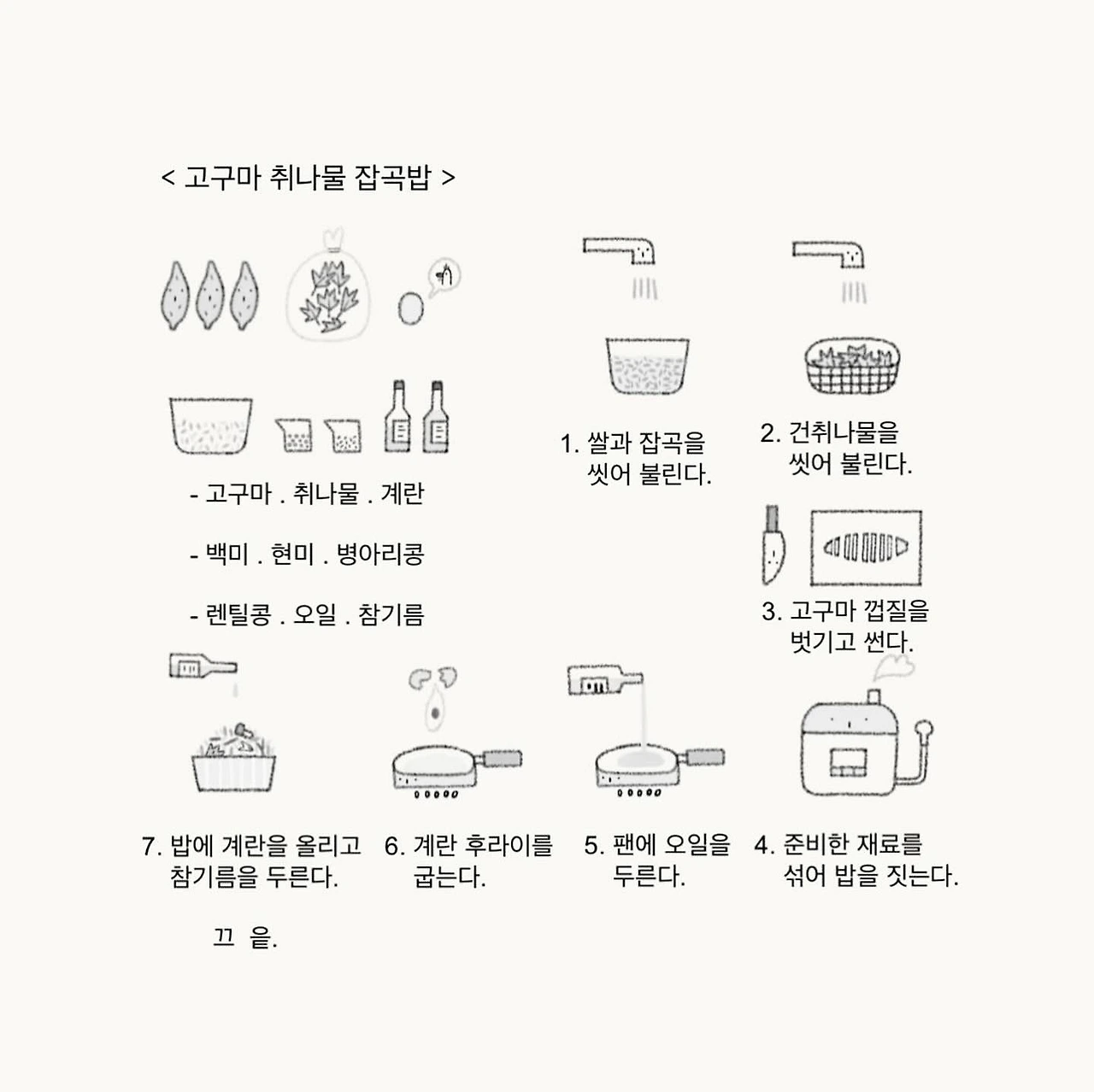 그리하여 이번 요리는 “고구마 취나물 잡곡밥”이다. 배고픈 시절을 떠올리면 구한말 스타일로 만들어봤다. 나는 겪어보지 못했지만 과거 전쟁 직후 먹을 게 없던 시절엔 보리밥에 고구마 감자를 섞어 먹었다고 한다. 그 눈물 맺힌 음식이 지금은 건강식이고 별미가 되었다. 그렇다고 마냥 다행이다 생각하기엔 이 시대의 아픔도 작지 않다 생각한다. 옛날이나 지금이나 가장 보통의 평범한 사람들이 가장 취약하지만 동시에 가장 강하지 않을까라는 생각이 든다.