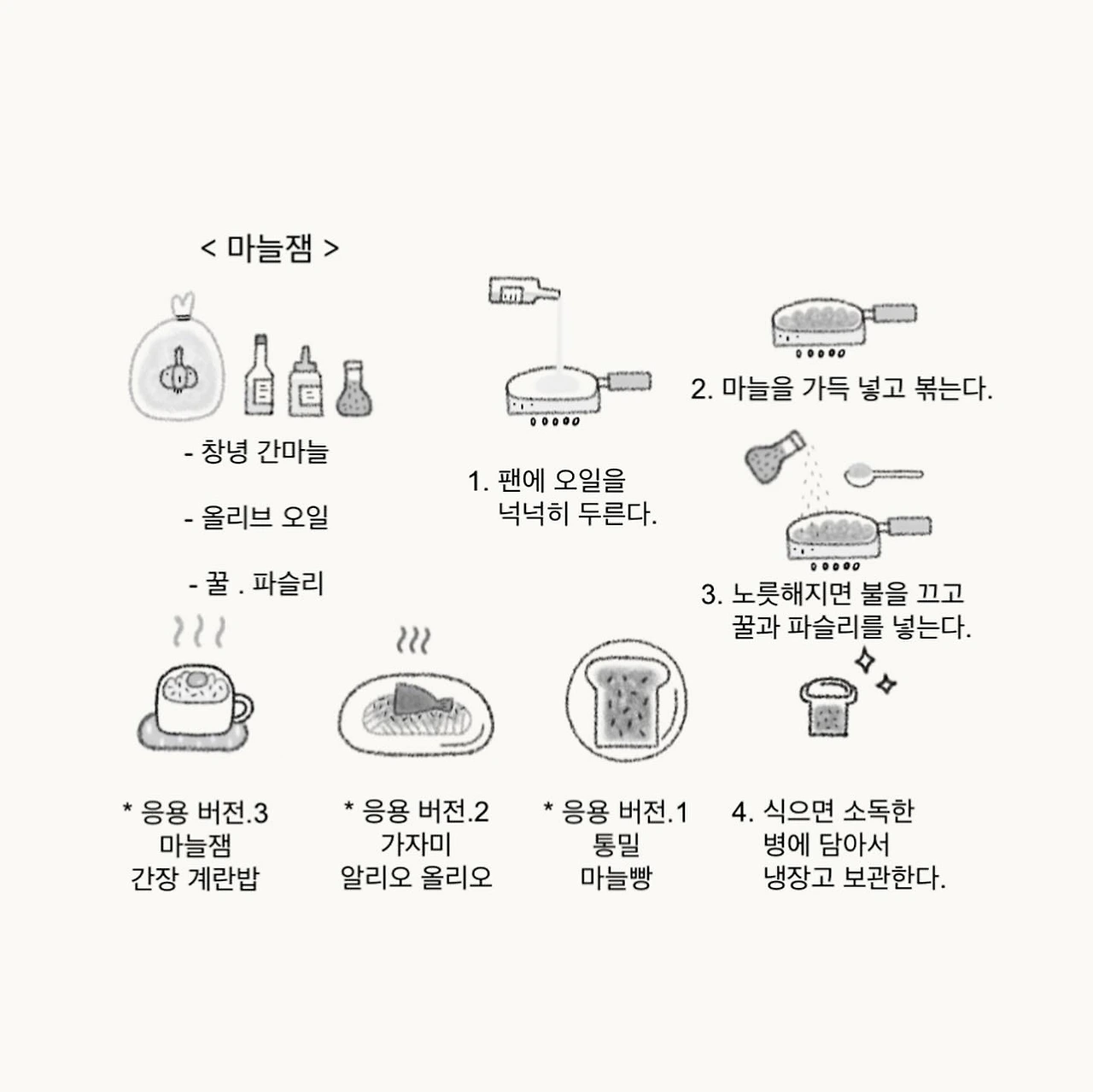 p.s 안녕하세요. 최집사입니다.^^ 이번에는 마늘이라는 재료로 여러 실험적인 요리에 도전해 보았습니다. 자세히 보아야 예쁘다는 말처럼, 마늘을 좋아하진 않지만 요리조리 자세히 맛보며 정을 들이고 있습니다. 남은 마늘잼으로 부지런히 정진해서 집순이 곰탈을 벗도록 해보겠습니다. 좋은 날씨 부지런히 즐기시고 건강하고 맛있는 식사도 챙겨드셨으면 좋겠네요. 읽어주셔서 감사합니다.