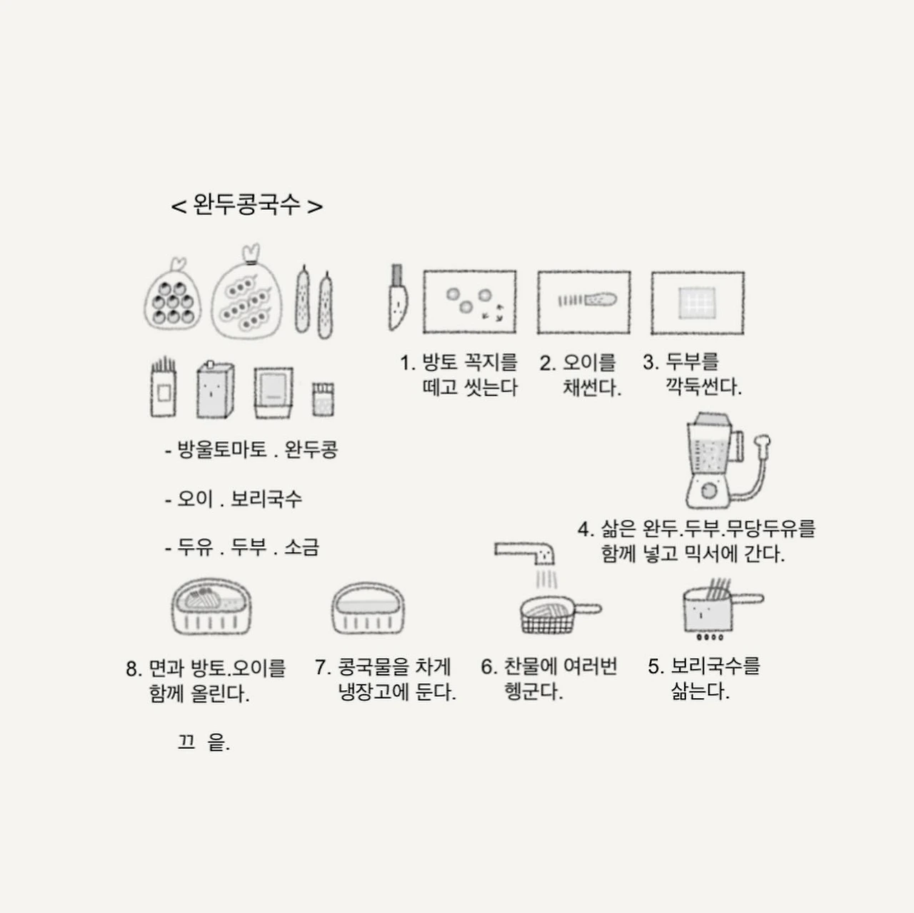 완두콩국수를 만드는 방법은 라면만큼 간단하다. 완두콩은 끓는 물에 삶아 두부, 두유, 소금 한 꼬집을 넣고 믹서에 간다. 이때 땅콩, 아몬드 같은 견과를 넣으면 더 고소해지지만 나는 깔끔한 맛이 추구하기 위해 패스했다. 완성된 콩국물을 냉동실에 잠시 감금시켜 급속냉각 시킨다. 그 사이 보리 국수를 삶은 뒤(평소 밀가루를 자제하고 있다.)찬물에 여러 번 헹궈 전분기를 빼고, 약간의 오이와 방토를 준비한다. 그릇에 차가워진 콩국물을 담고 보리국수를 동그랗게 말아 한쪽으로 올린 뒤, 오이와 방토로 데코를 한다. 기호에 따라 계란을 삶아 올려도 좋다.